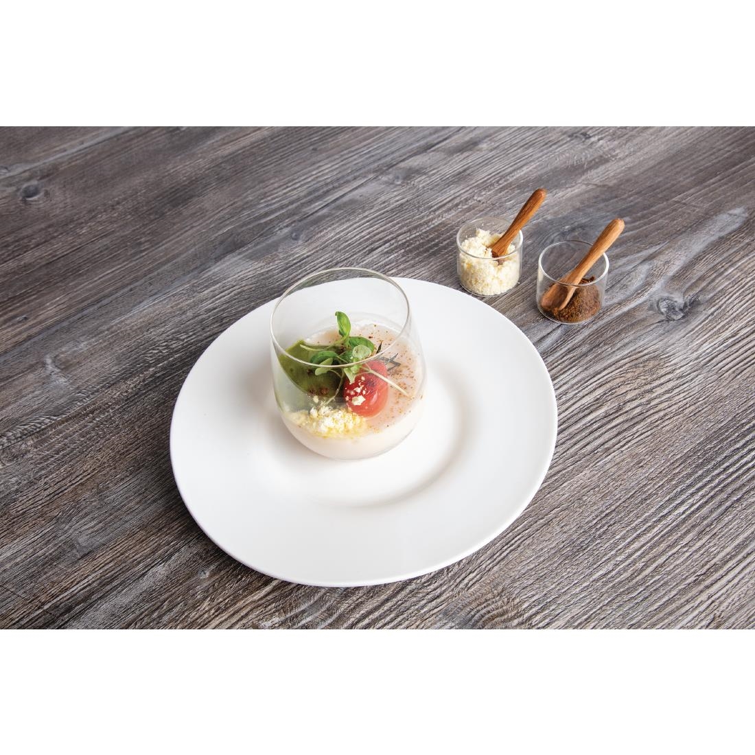 Lumina have designed and created this extra-wide rim plate to allow modern cuisine to be displayed at its finest. The space in the middle is just right for small, perfectly presented starter dishes, whilst the extra-wide rim provides a canvas for garnishes or decoration to artistically spill out and onto the border.