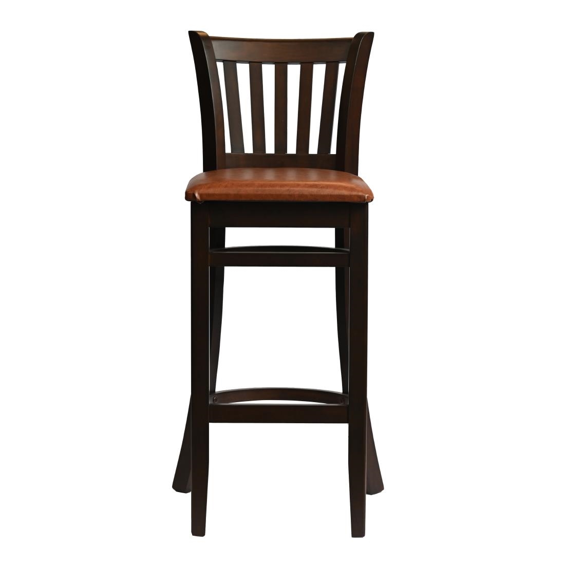 The Manhattan bar chair is the perfect height to pair with a poseur table, drinking shelf or right there in front of the pumps. Made to contract furniture standard, its solid wood construction ensures sturdiness and longevity, allowing the chair to withstand the demands of commercial environments. Its distinctive curved back with vertical slats offers a touch of traditional flair while providing excellent lumbar support. A bison tan fabric covers the padded seat, adding a layer of both comfort and sophistication.