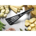 Strong, hygienic and easy to clean this black exoglass perforated spatula from Matfer Bourgeat can also resist temperatures up to 220 degrees Celcius, making it suitable for many cooking and preparation tasks. Made from rigid exoglass, this utensil is highly robust and versatile, making it ideal for use in a commercial kitchen setting.