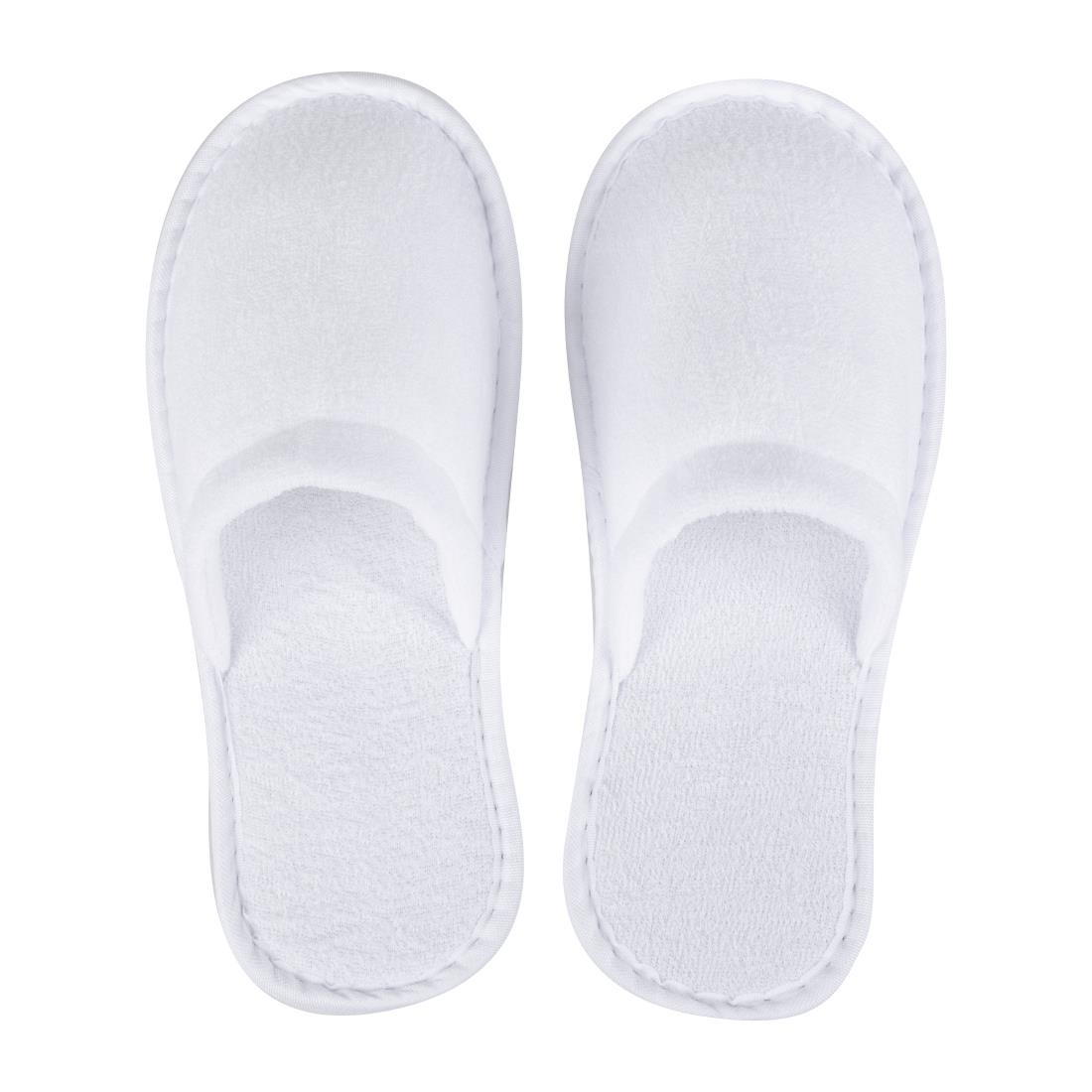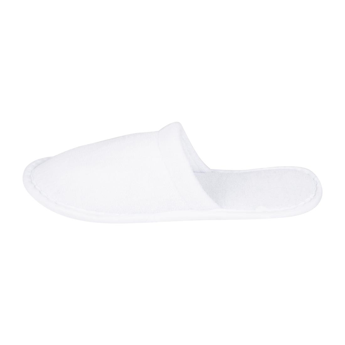 With their soft feel and luxurious material, these Mitre essentials closed-toe slippers are a must-have in hotels and spas. Thanks to their universal size, these slippers can be enjoyed by a wide variety of guests. Additionally, the white colour provides a classic ‘spa’ look that helps to spruce-up any washroom. The slippers come supplied in a cardboard sleeve to reduce plastic waste.