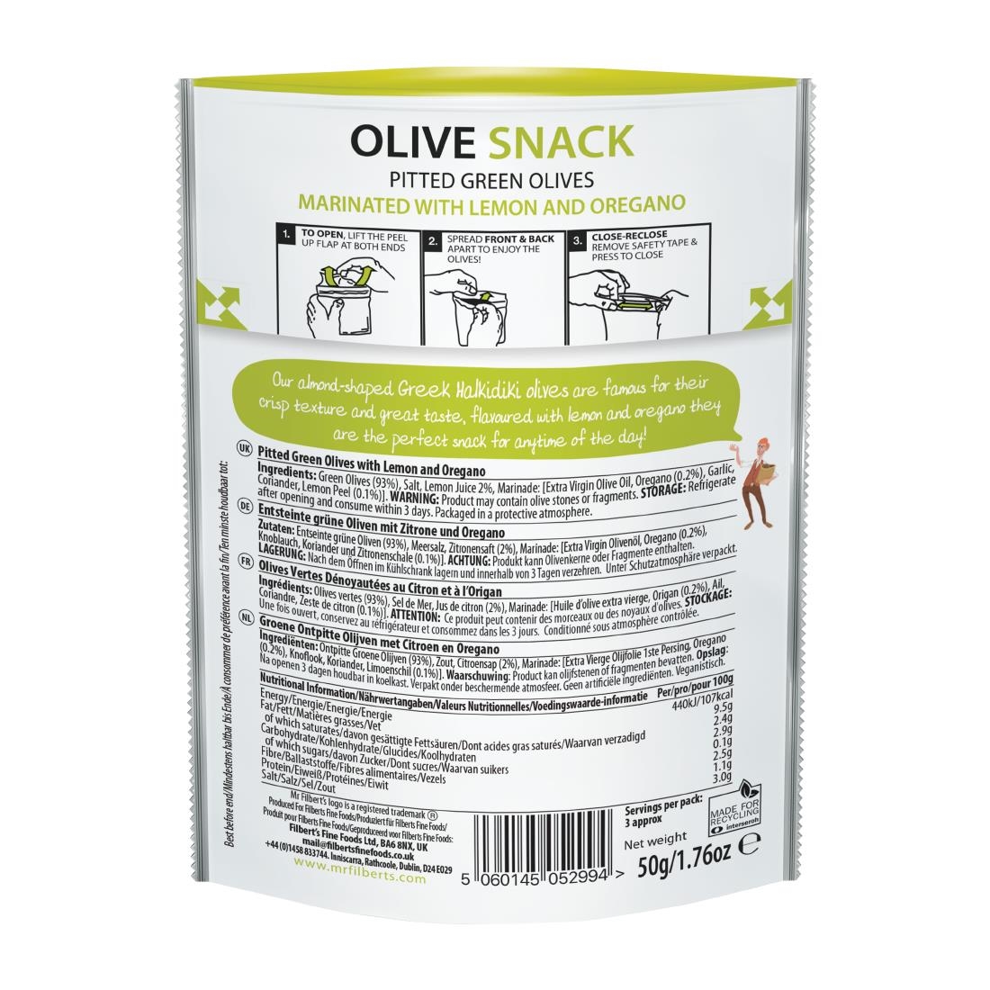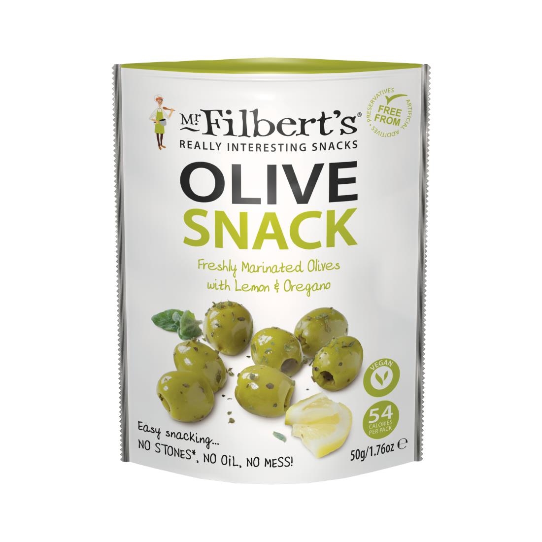 No stones, no oil, no mess – Mr Filbert’s green olives lemon and oregano snacks are 100% natural and contain only 54 calories per pack.