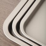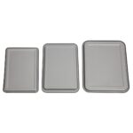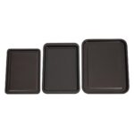 Be prepared for any small baking task by having these three trays ready to call upon. Part of the everyday Nisbets Essentials range, the set includes 320mm, 360mm and 390mm baking trays – each with a depth of 25mm. The steel trays have a double non-stick coating, ensuring an effortless transfer of food from tray to cooling rack. By reducing the risk of ripping or tearing your baked creations, impeccable presentation is also assured. Afterwards, the trays are easy to clean and maintain, ready for repeated use in a busy kitchen.