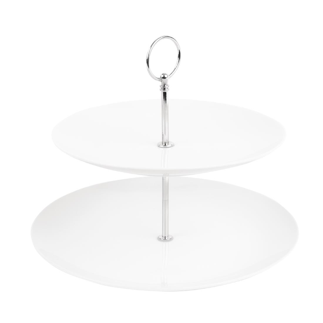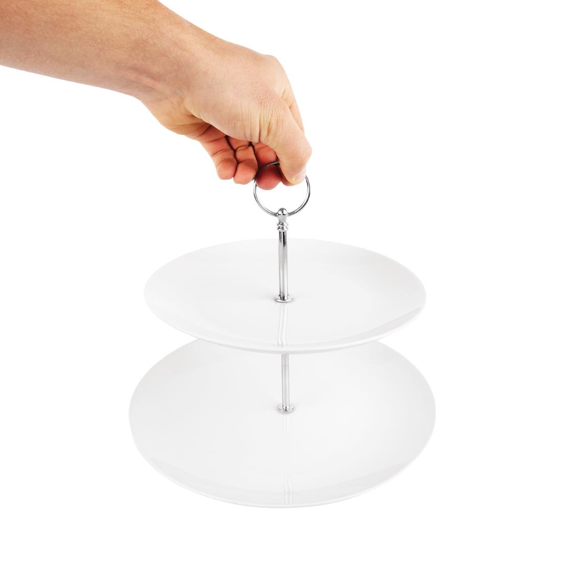 Create a charming cake display, with this cake stand from Olympia.This attractive cake stand is perfect for an afternoon tea table. Featuring two tiers, you can put two types of cake on the stand and create a very stylish and enviable display. The two porcelain plates hold the cakes, while the bar in the middle creates the stand. There’s also a pleasant little ring on top for ease of lifting. Fill the two tiers with your favourite cakes and pastries and delight your guests and customers.