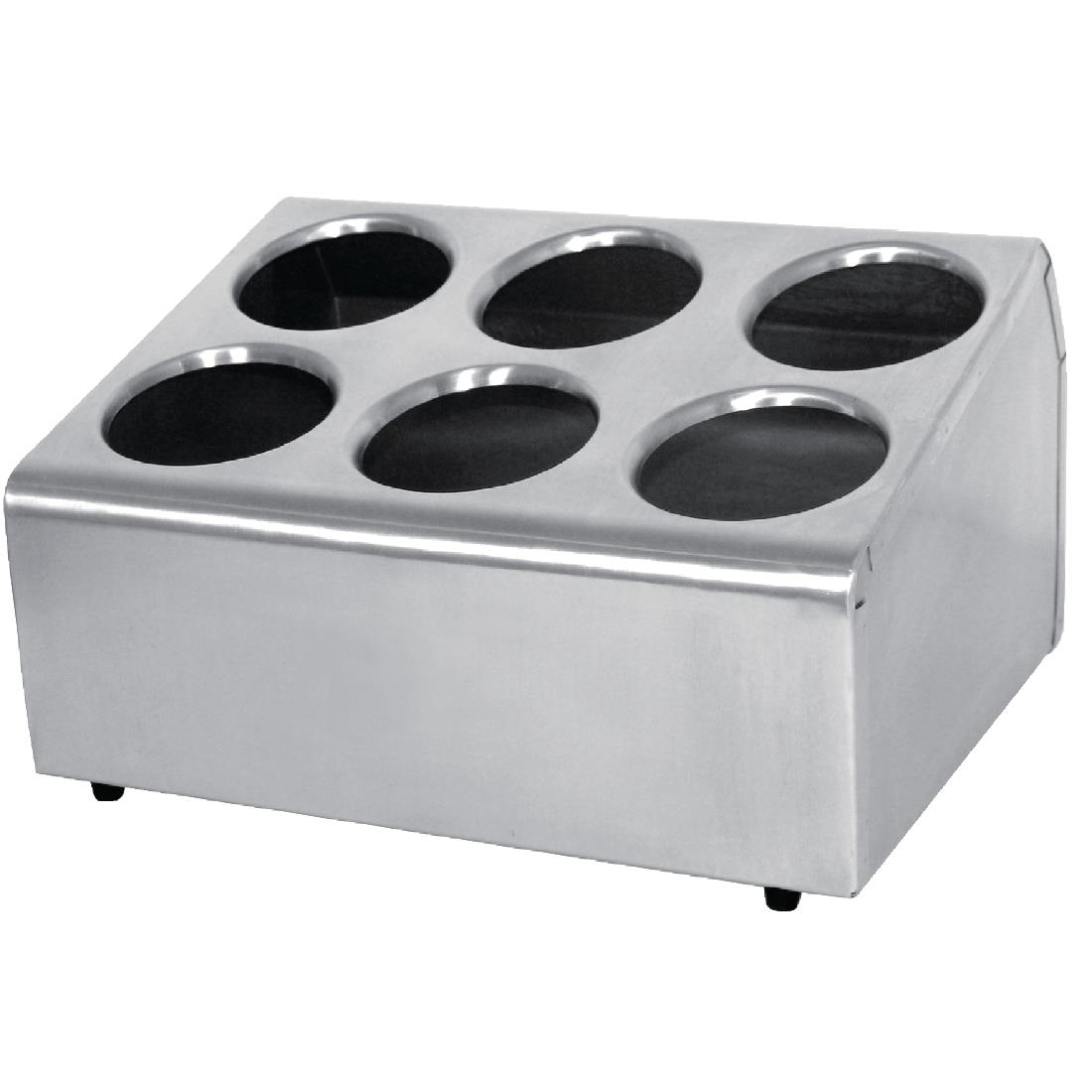 If you’re looking for a practical and hygienic way to provide guests with self-serve cutlery, then this 6-slot cutlery basket holder from Olympia is perfect for you. Crafted from stainless steel, the holder boasts excellent durability to provide long-lasting use within commercial environments. Suitable for use with plastic or metal round cutlery baskets (sold separately) which allows staff to restock cutlery with minimal effort.