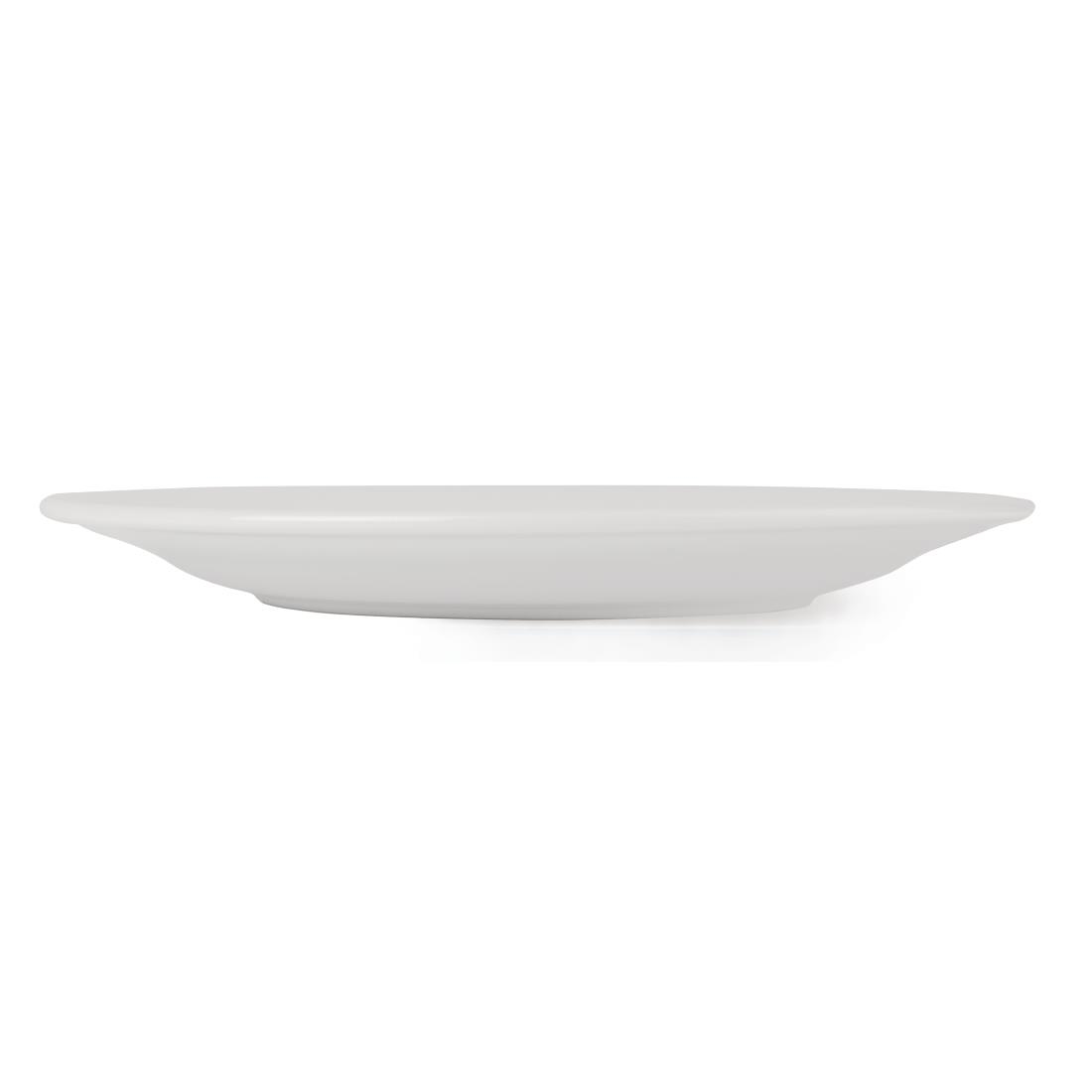 Want to spruce-up your dining services with crockery that’s made to last? Then these 254(Ø)mm Olympia Athena wide-rimmed plates are the perfect choice for you. As they’re made from super-vitrified porcelain, these plates boast an extra-hard glaze that makes them highly resistant to scratches and nicks caused by sharp cutlery. This vitrified construction also stops liquids from seeping into the surface of the plates – so they’re sure to stay in as-new condition throughout your guests’ regular use! And thanks to the rolled edges, these plates have great chip-resistance too, allowing them to withstand knocks and blows without damaging. Once service is over, the plates can be safely used in a dishwasher, thanks to the super-vitrified material – giving your staff a quick turnaround of fresh crockery!Plus, the crisp-white colour creates a neutral canvas that ensures the your dishes’ striking tones really stand out – adding the special touch to your food presentations and giving your guests a true, gourmet experience.