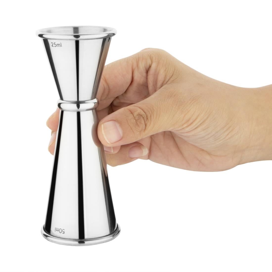 Every barman needs a good jigger. This stainless steel, double-sided jigger serves 25 or 50ml into rocks glasses, cocktails or mixed drinks. Machine washable and very simple to use, this jigger is freestanding and clearly marked. Also available in gunmetal (DR627) and copper (DR606) to suit your business’s individual style, this jigger is recommended for cocktail usage.