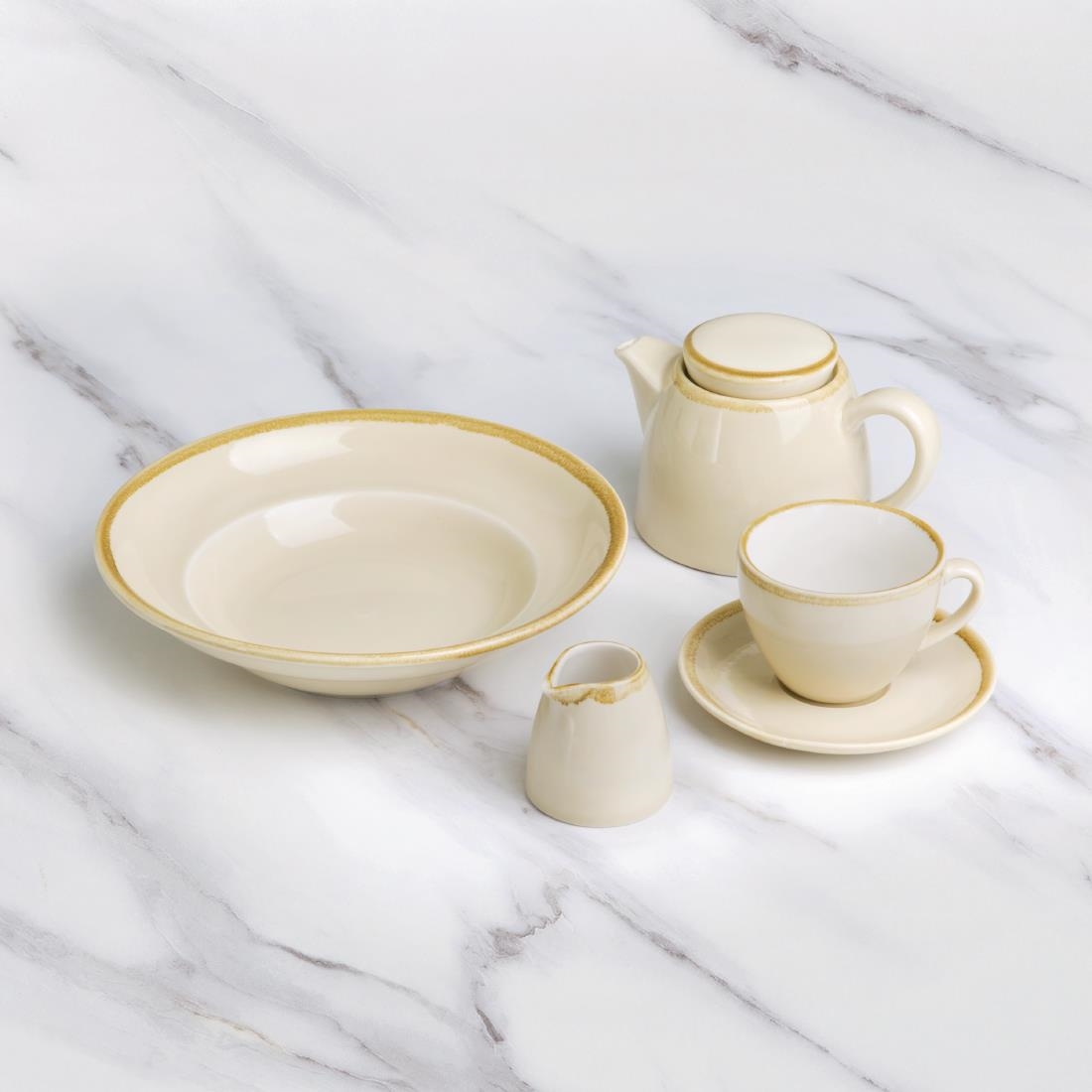 Delight your guests with beautiful dining displays from Olympia Kiln designs. This sandstone pasta bowl is elegantly finished with a reactive glaze that gives a gorgeous mottled effect on the bowl. The colouring of the bowl itself is a light beige with a darker brown effect around the rim to truly highlight every dish you send out. Made from high quality porcelain, the bowl is dishwasher safe and quick to dry: making tidying up and getting the bowl ready for the next customer quick use. Each bowl comes with an edge chip warranty too for your peace of mind.