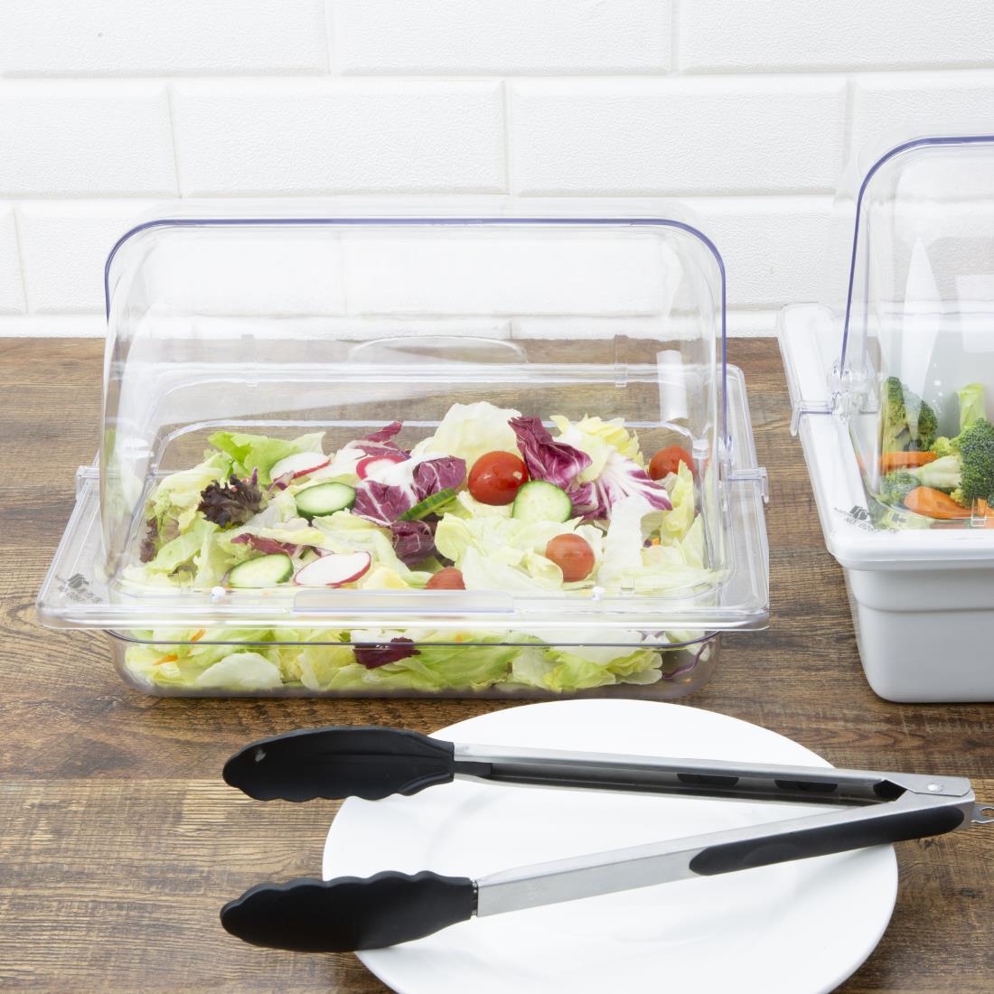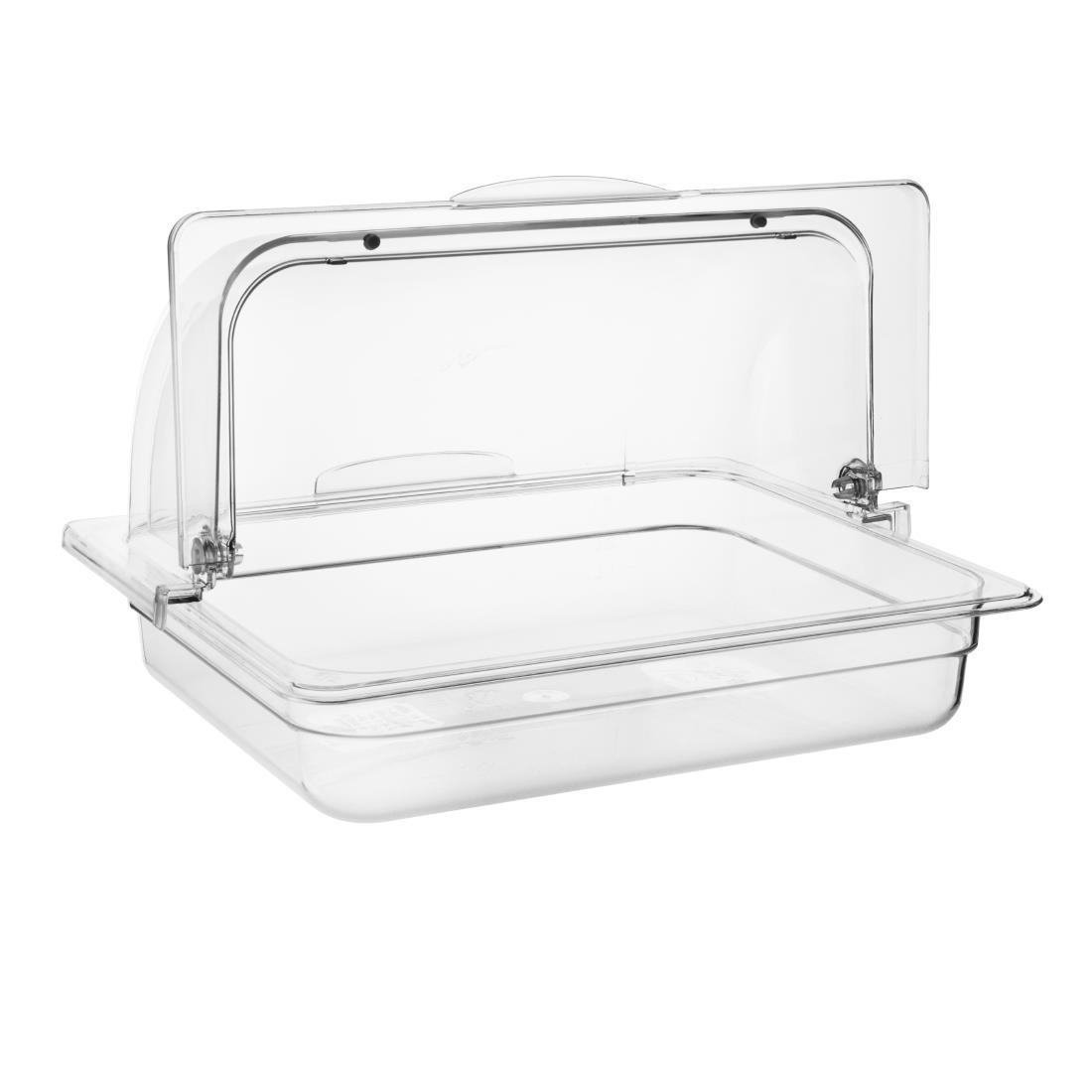 This polycarbonate rolltop cover from Olympia’s Kristallon collection not only provides the look and feel of glass but also a clear construction for better product visibility. It is perfect for displaying goods at a café, restaurant, or bakery, or even for a buffet service to display pastries and other baked goods. The rolltop cover is also shatter resistant for added durability and can be easily wiped clean or washed in the dishwasher.