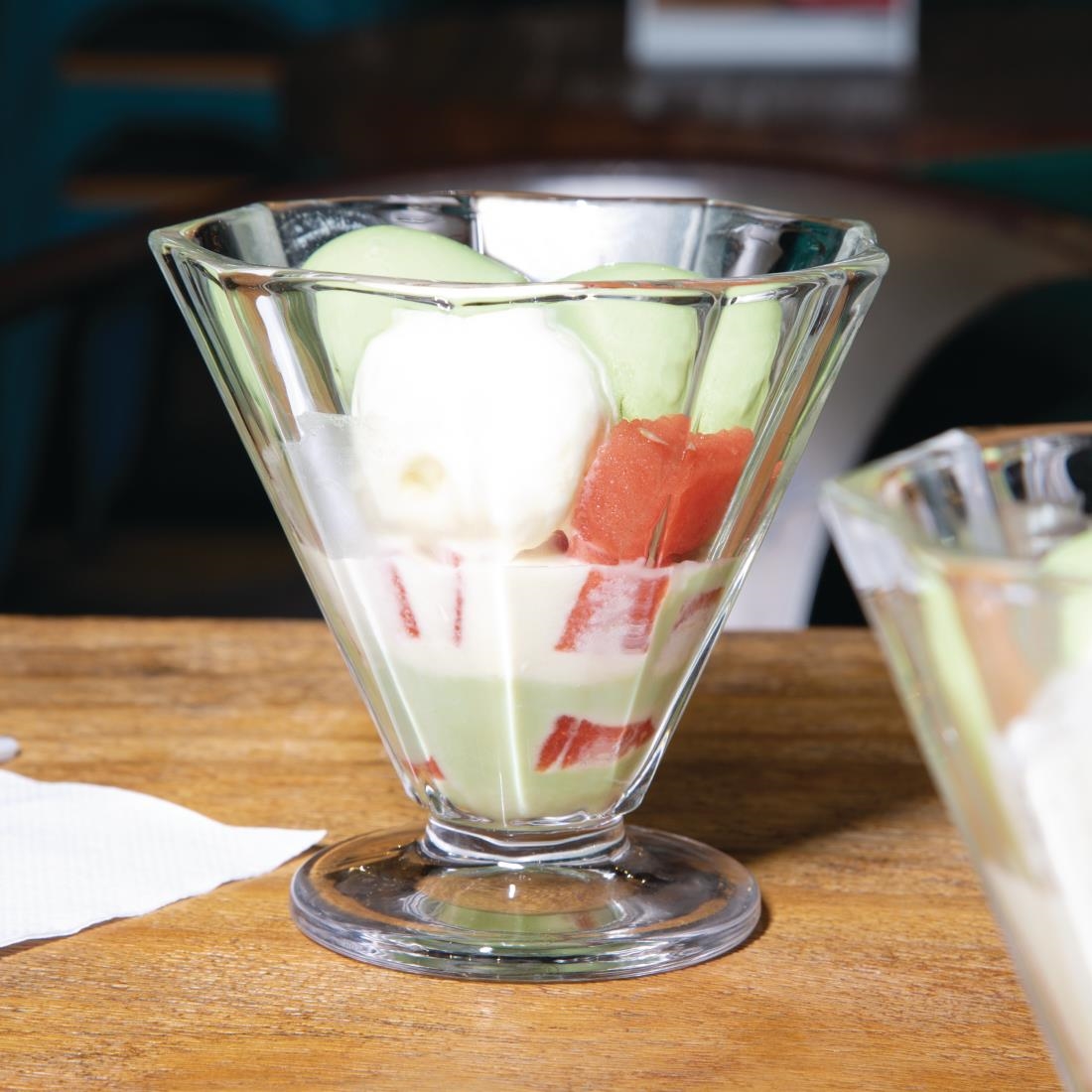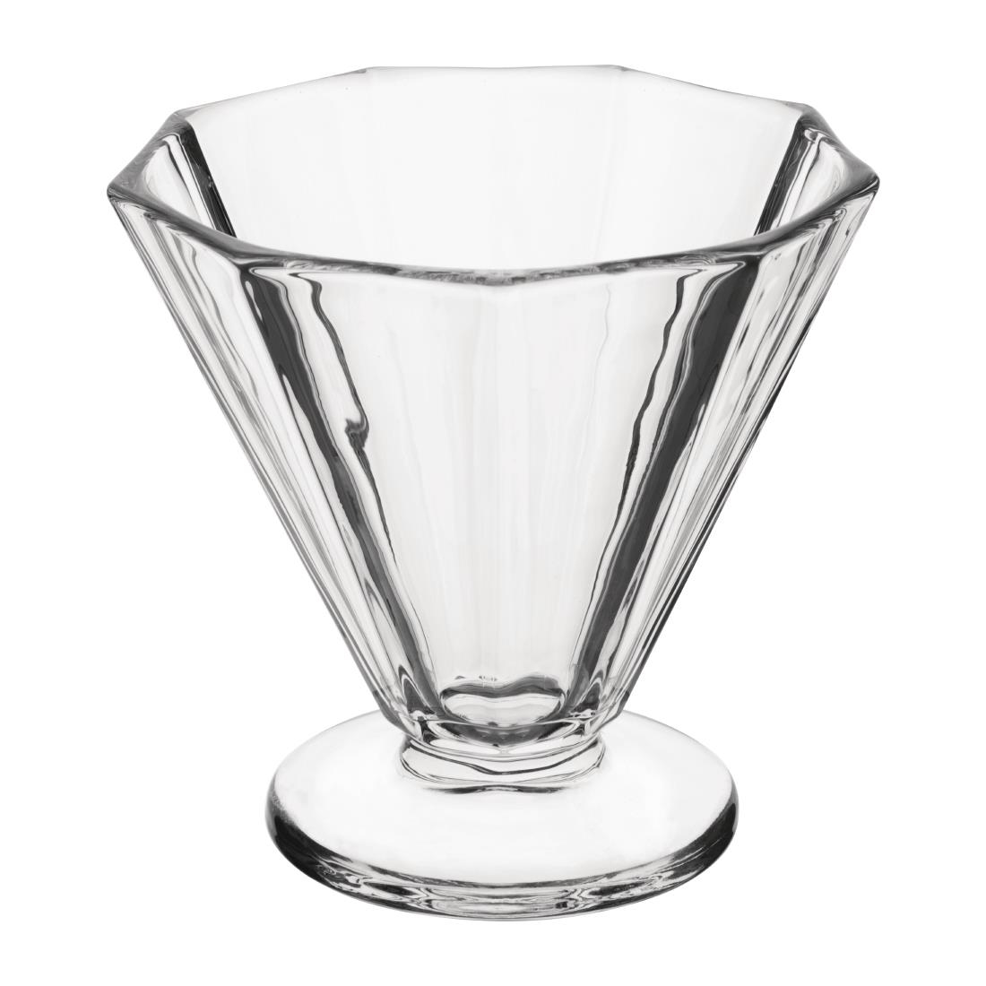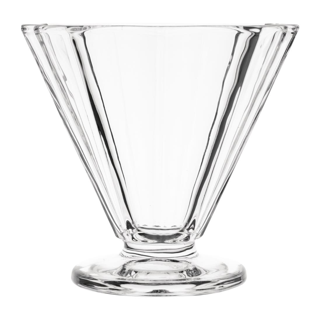 Add a vintage touch to your dessert options, with the pack of 24 Olympia sundae glasses. Designed to house fruits, ice-cream or other desserts of your choice, these fluted glasses are as versatile as they are stylish. The cone-shaped bowl allows you to layer desserts for a unique and creative design. The glass material allows for easy cleaning after use, meaning you spend less time at the sink, and more time serving customers.