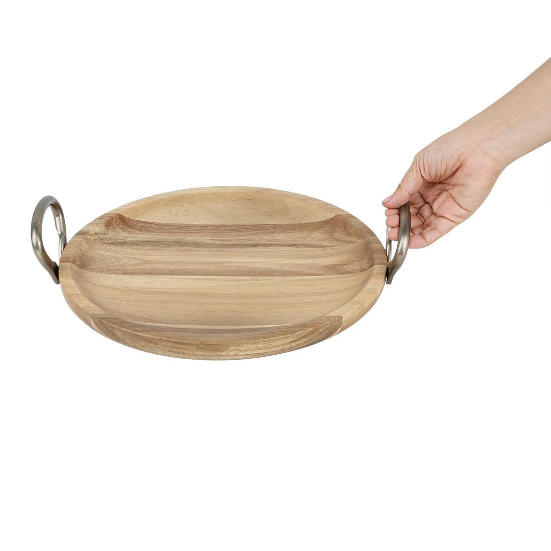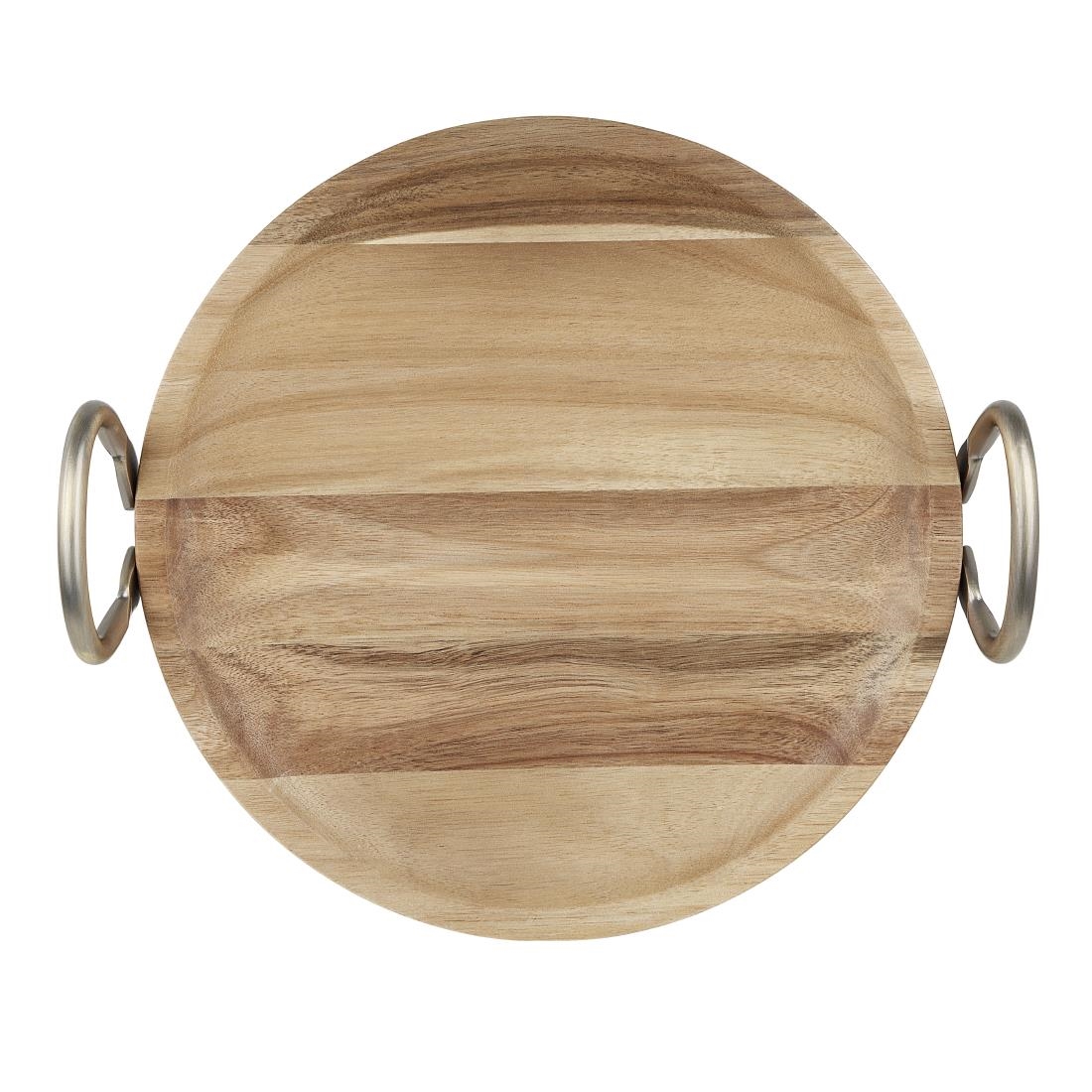 Add a natural, rustic charm to your food presentation with this round acacia wood dish from Olympia. Ideal for serving a variety of foods, the dish is a versatile addition to any dining setup. Crafted from acacia wood with metal handles, it not only enhances the aesthetic appeal of your table but also provides long-lasting functionality. Measuring 345 x 305mm, the dish offers ample space for showcasing your culinary creations.