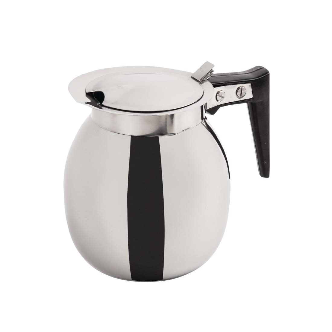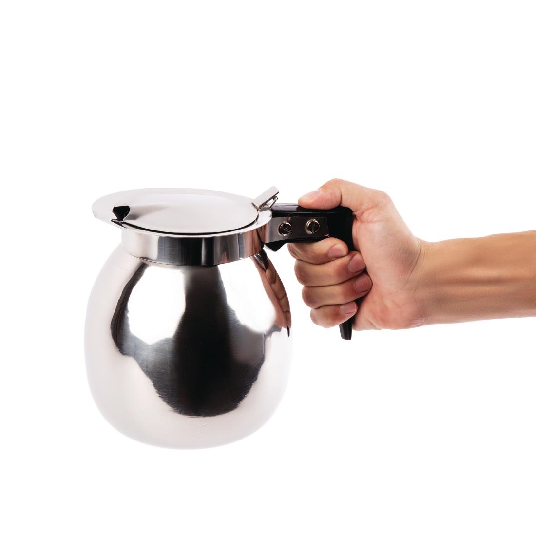 This stainless steel coffee decanter is an extremely strong and damage resistant way of serving filter coffee. The easy to use lid ensures that liquid stays hotter for longer and the wide spout makes for quick coffee pouring. The carefully designed handle is designed to resist heat transfer and ensure that it is comfortable to serve coffee throughout the busiest services.