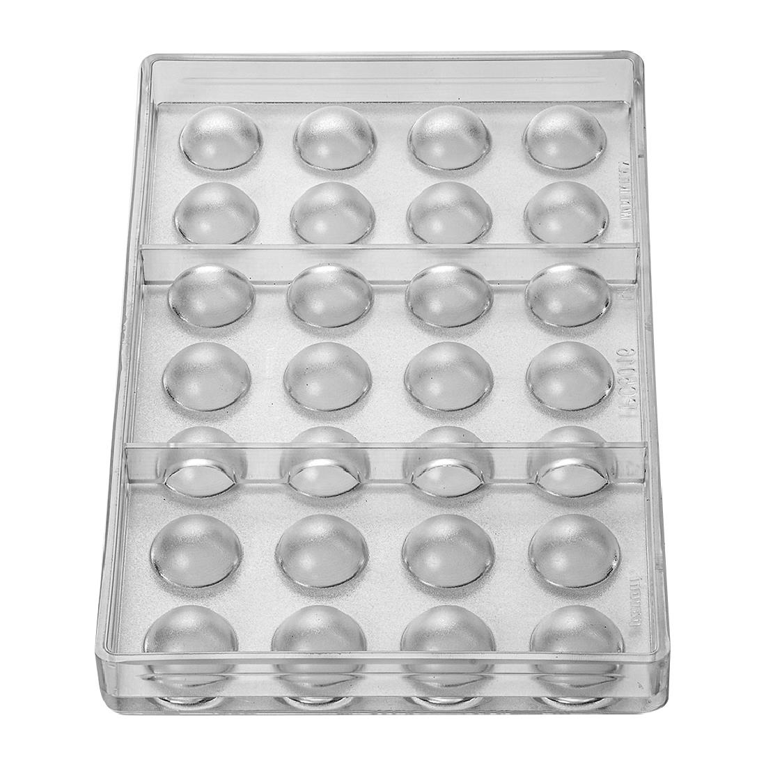 This mould makes up to 28 25x12mm round chocolates per batch and is sized 275x175mm.