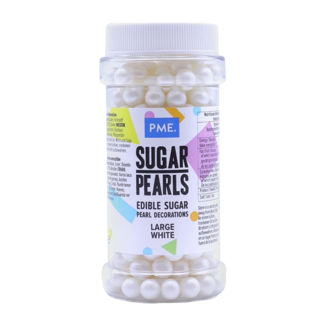 PME’s large sugar pearls are packed into a secure screw lid pot that contains 90g of coloured pearl decorations.