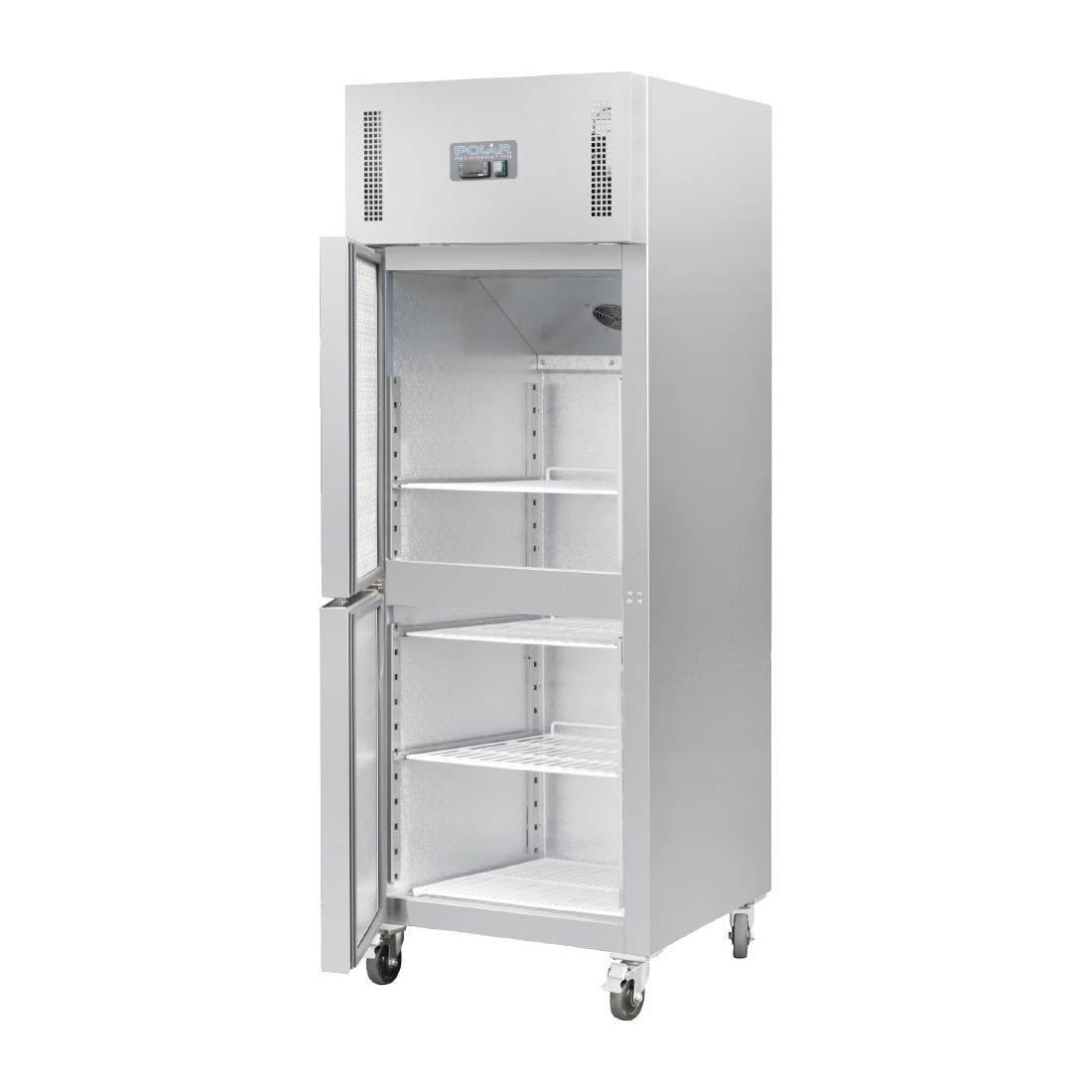 The Polar G-Series gastro refrigerator is the ideal commercial fridge if you’re looking for professional performance, reliability and efficiency. With lockable stable doors, you can choose to open only the section you need, meaning the fridge retains temperature more efficiently than full-door versions. The powerful cooling system provides reliable refrigeration around the entire unit, ensuring that all produce is kept at the ideal temperature and reducing the risk of wasted foods. Double size (2/1) gastronorm pan compatibility adds convenience, allowing you to transfer up to ten entire double pans of ingredients between appliances to save time. For precision, the fridge also includes a fully automatic controller with constant digital temperature display. Easy to use, clean and maintain, this fridge is the ideal solution for professional kitchens. Polar G-Series kitchen refrigeration is designed for everyday commercial use in demanding professional environments. With strong commercial construction and hard-working compressors, choose G-Series refrigeration if you need a long-lasting, hard-working unit which will be accessed frequently. The G-Series range excels in conditions up to 32°C.How many kWh does this unit use per day?The fridge uses a total of 1.247kWh per day. Full information on energy efficiency, annual consumption and other specifications can be seen in the Energy Rating Information table below. How many 2/1 GN pans can fit in this fridge?This unit can house up to ten, 2/1 GN pans at a time – making it ideal for transferring large amounts of food, to and from storage and preparation areas. What refrigerant does this unit use?This fridge uses the R600a refrigerant. R600a is an excellent refrigerant, due to its low environmental impact and excellent thermodynamic properties.