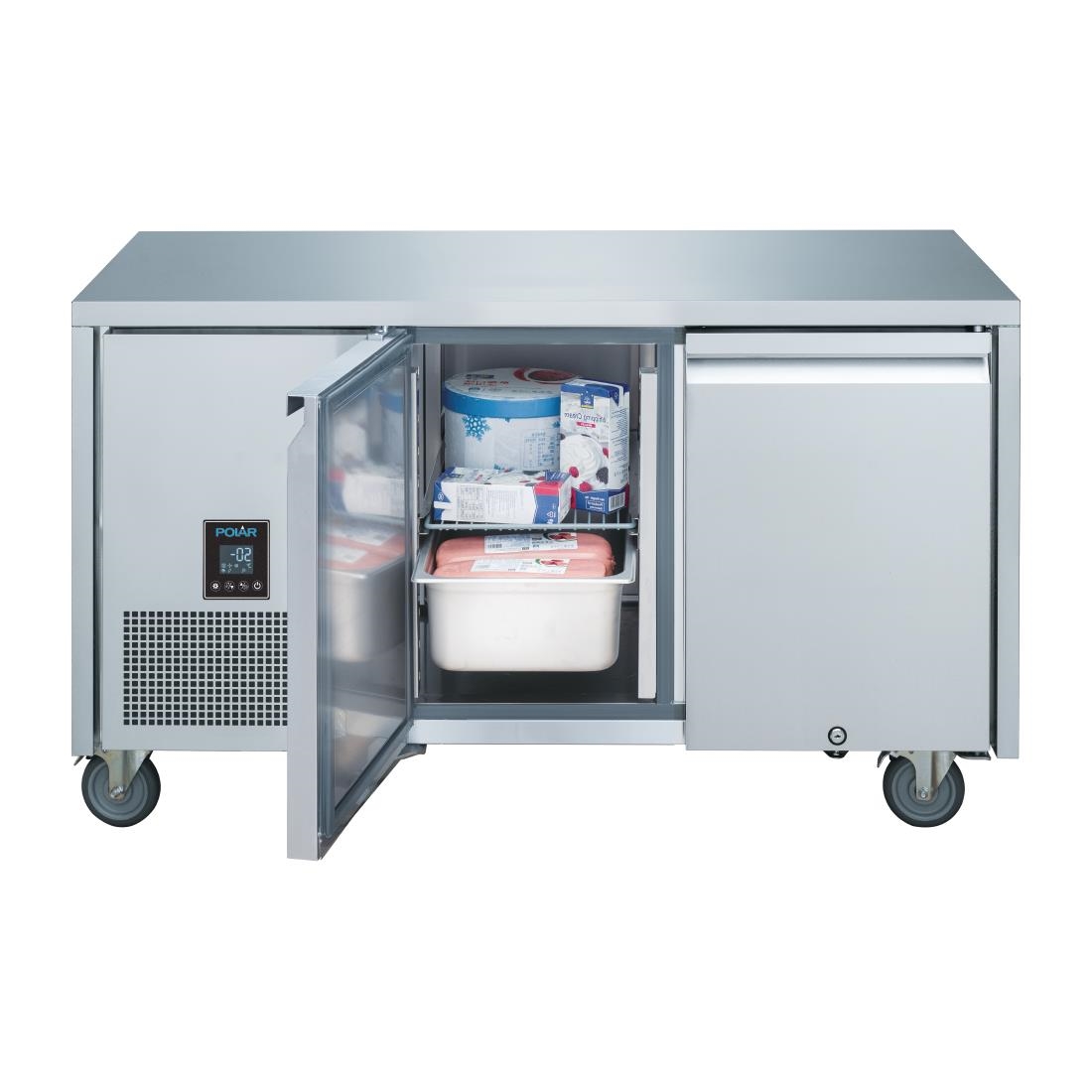Designed to work in the high temperatures of any busy commercial kitchen, this double-door counter freezer from Polar’s U-Series is sure to provide effective cooling to any medium or large kitchen. Featuring an intelligent, easy-to-use digital controller, this freezer allows you to alter settings or temperature with minimal effort. This freezer is designed with a powerful, forced-air cooling system that ensures that consistent and reliable temperatures are maintained around the entire freezer – ensuring all food is effectively preserved.The freezer is designed as a 2-in-1 unit that can be used to store your frozen goods, whilst featuring a stainless-steel countertop that can be used during preparation tasks. This combination makes it easier for you to remove and prepare frozen ingredients in the same location – saving you time from walking back and forward between areas of the kitchen. The freezer is constructed with 196 litres of split, usable storage that allows you to store food groups separately. Anti-tilt, E-shaped shelf supports allow you to place shelving and 1/1GN pans together – helping to save you vital storage space whilst making it easier to take foods from frozen, to cooked. Made with a stainless-steel interior and exterior, this unit is easy to clean and durable to most wear and tear that occurs in a commercial kitchen – helping to save you time on maintenance and money on replacements or repairs. Polar U-Series is the pinnacle of the Polar kitchen refrigeration range, designed to reliably store your most valuable produce. Built to the highest commercial specifications, these units feature powerful forced air cooling – perfect for reducing food waste whilst conserving food taste. If you expect to access the unit very frequently, Polar U-Series refrigeration reliably keeps a consistently cool temperature, even in conditions up to 43°C.