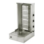 The heavy duty Roller Grill Electric Gyros or Kebab Grill GR 80E is ideal for all types of doner kebabs and has the capability to support 40kg of meat thanks to the innovatively designed ball bearing system put in place to protect the motor. The tower moves front to back to allow for different sizes of products and the spit is easily placed with one hand. Featuring low and high heat settings with independent burner and element control, the front access drip tray also means the machine is easy to clean. This high quality shawarma grill can be configured with single or 3 phase power.