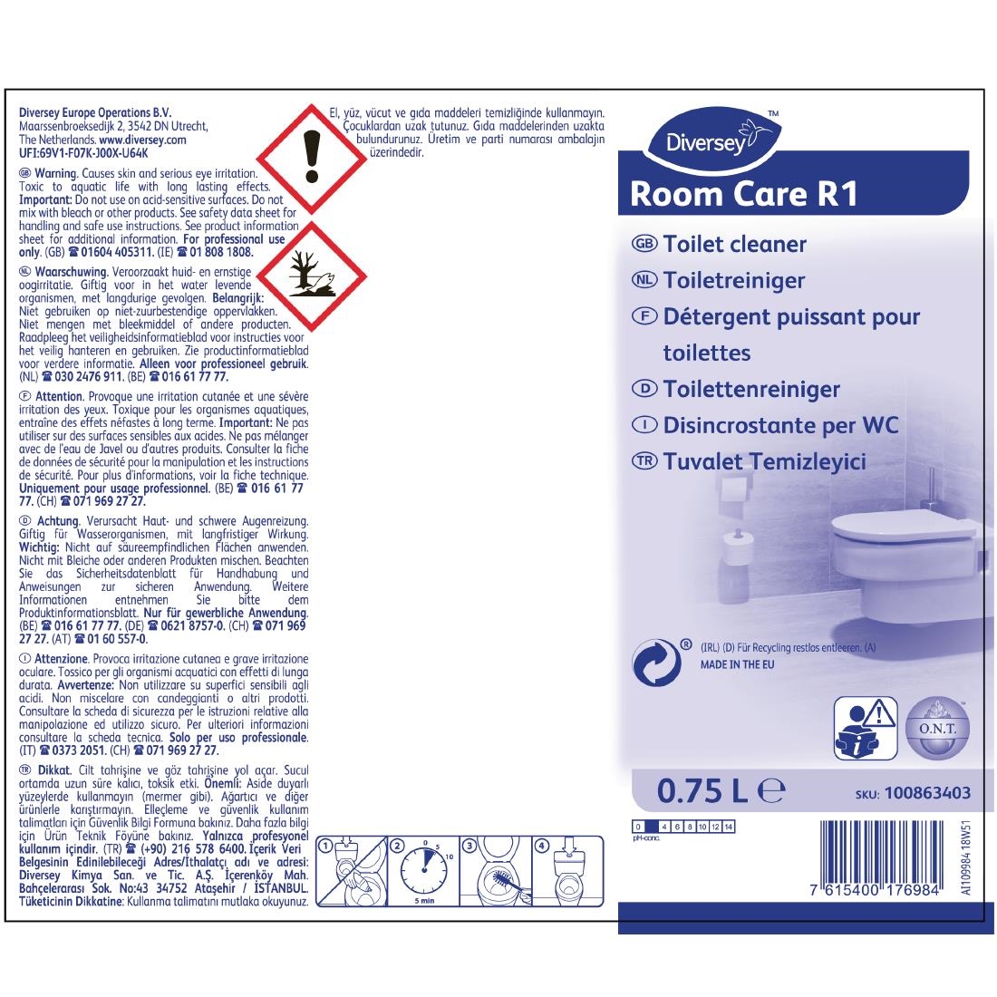 Hold your guestroom toilets to the highest possible hygiene standards with this pack of 6 x 750ml Diversey Room Care R1 toilet cleaner ready-to-use bottles. This viscous, citric acid-based solution is designed to target and quickly eliminate stains, uric acid and limescale in your toilet bowls. As such, this cleaner will make it easy for you to keep your facilities incredibly clean, hygienic and fresh, ensuring customers have a great first impression when entering your guestrooms. As this chemical is lightly fragranced, it will also leave behind a pleasant smell and add an extra touch of freshness to your facilities. This solution is also suitable for use on your washroom surfaces, giving you a highly versatile and effective cleaner at a budget-friendly price.