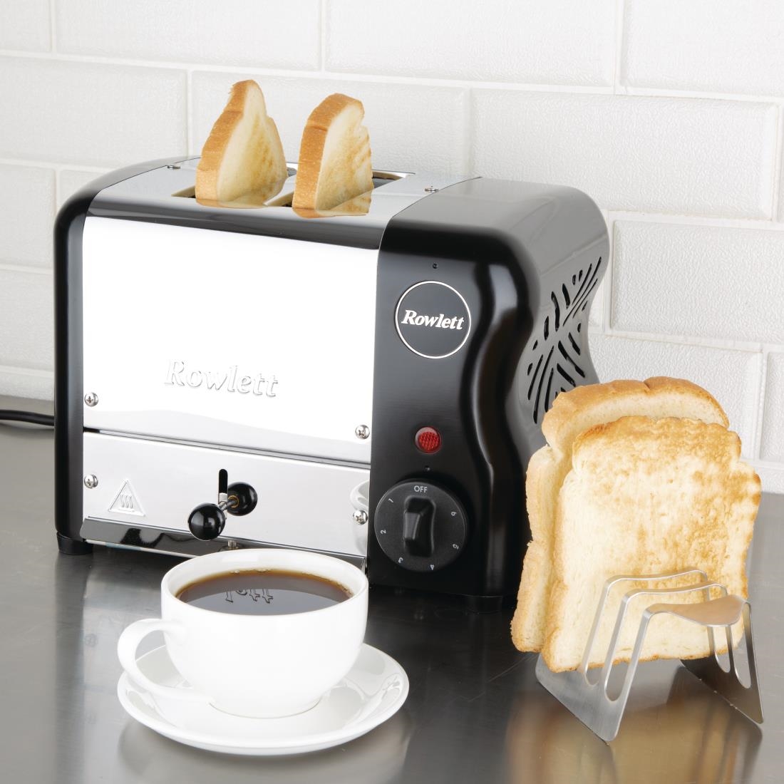 Compact and stylish, the Rowlett two slot toaster boasts impressive commercial cooking performance alongside sleek and attractive front-of-house styling. Simple rotary slot selection and manual timer control ensure effortless, flexible operation, whilst the handy pop-up lever helps you to achieve perfectly golden, deliciously toasted bread every time. A fantastic quality British-designed toaster.