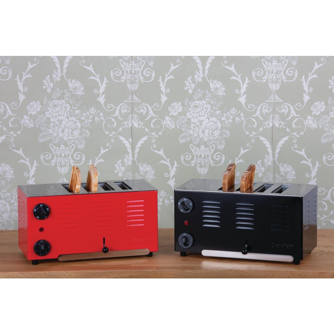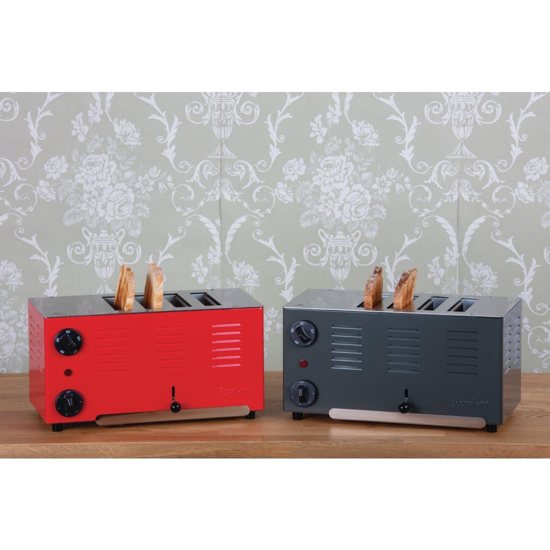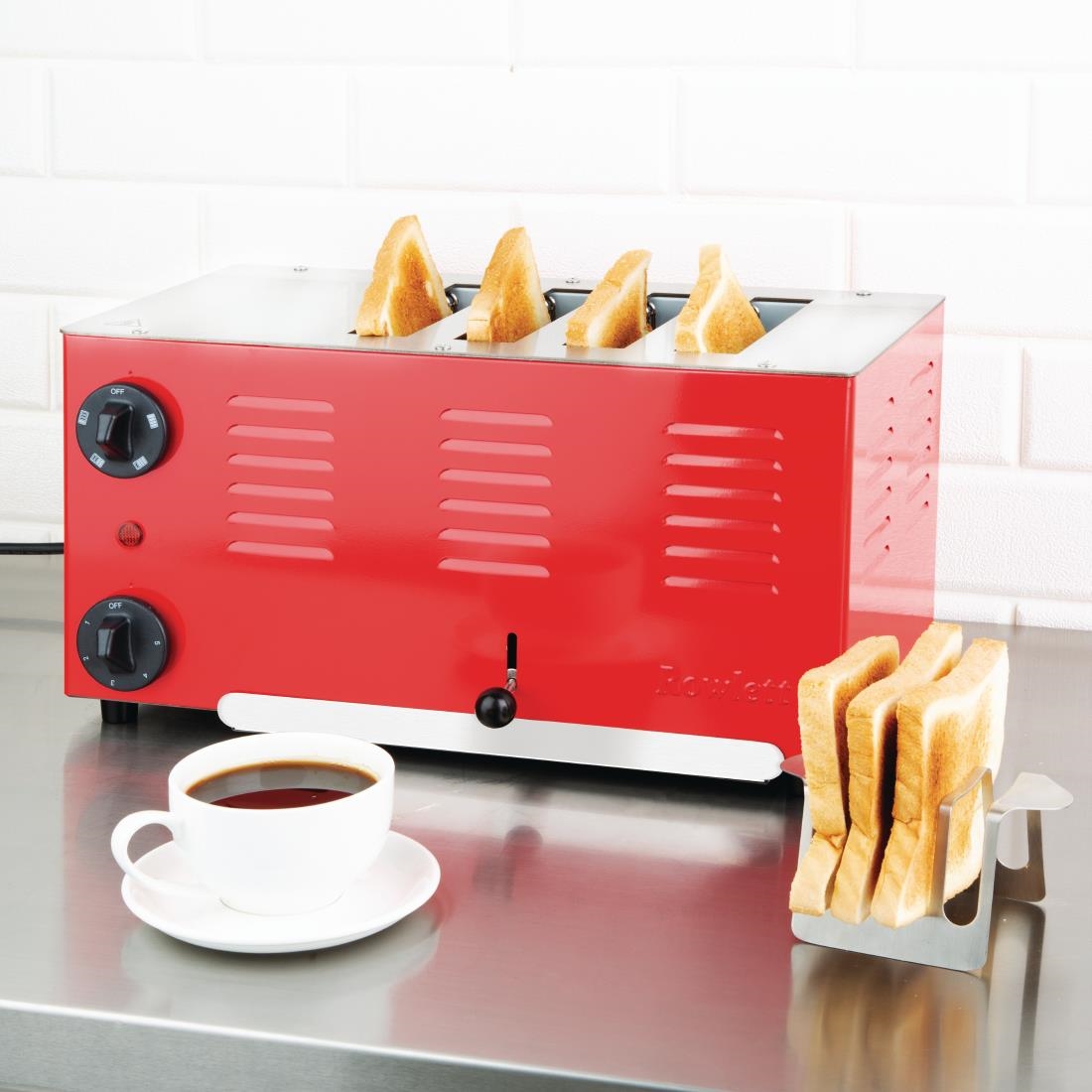 Reliable, powerful and highly stylish, the Rowlett four slot toaster in Traffic Red combines a classic design with user-friendly functionality. Designed in the UK, the Rowlett features a handy dial timer and slice selector, enabling efficient operation and perfectly consistent, perfectly cooked toast every time. The attractive red finish makes the toaster ideal for any front of house or home kitchen with a similar colour scheme.