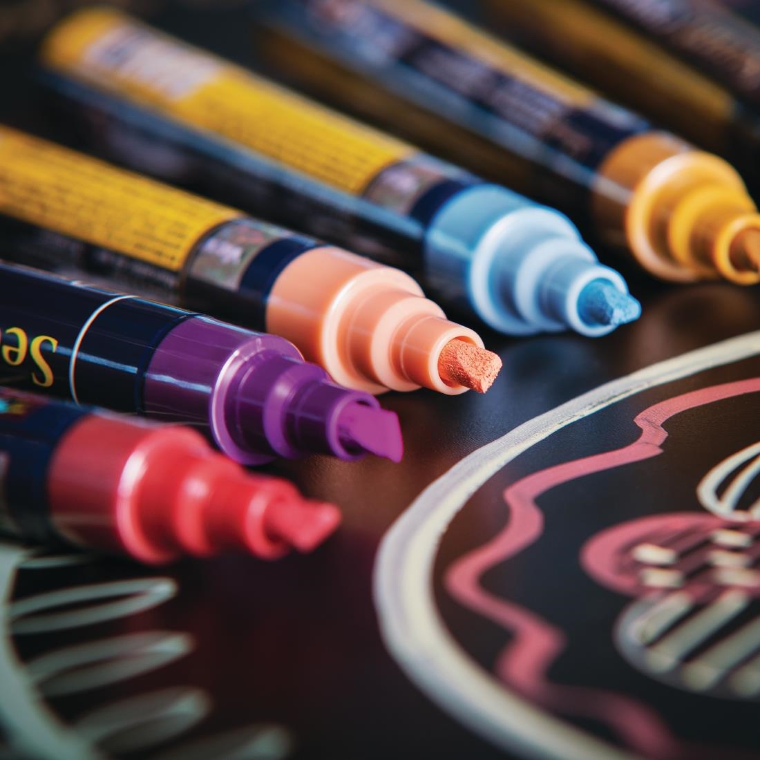 Get everything you need for memorable mini blackboards and perfect pavement boards in this Securit liquid chalk pen set. Containing a classic white Chalkmarker alongside a range of primary and secondary colours, this blackboard pen pack is perfect for creating specials boards which can’t be missed. Easily cleaned with Securit chalkboard spray (Y994), allow pen to fully dry before moving for best results.