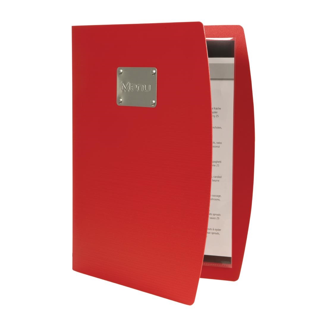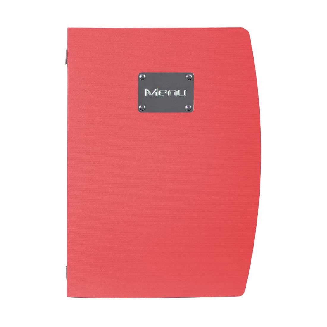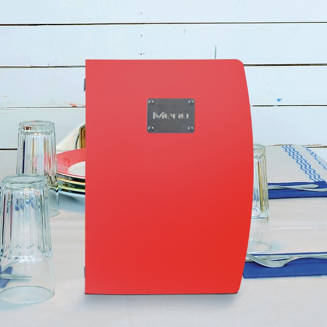 Securit’s A4 Rio menu cover is the modern, curved cover designed to draw the eye of customers to your menu. These red menu covers make a bold statement, which is completed with the stainless steel menu plate on the front cover. With an elasticated inner cord to hold inserts in place, this menu cover is easy to expand using additional Securit menu covers (H600) and is available in a range of alternative colours.