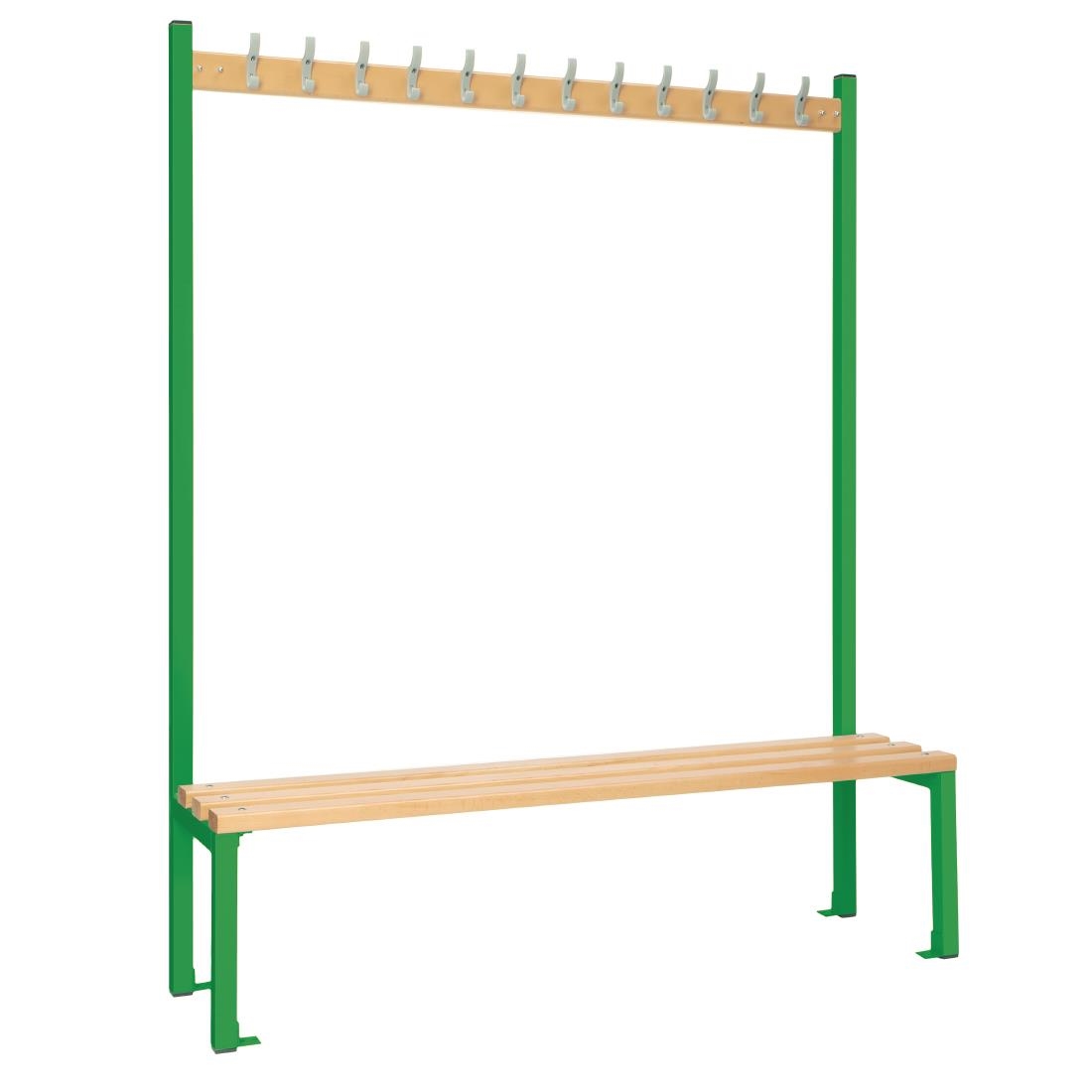 This single-sided seating island is an ideal choice for various settings such as schools, gyms and staff changing rooms. Constructed with durability in mind, its robust steel framework is powder-coated in a bright green shade, ensuring both strength and a visually appealing design. The slatted seat, crafted from hardwearing beech wood, offers comfort and support, making it the perfect furniture piece for any changing space.