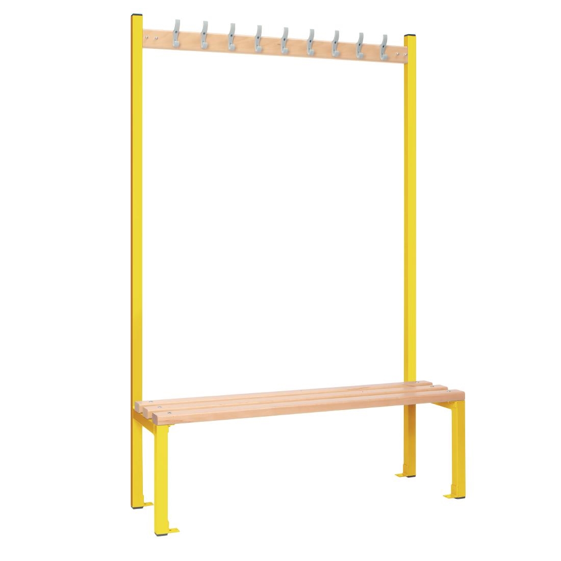 This single-sided seating island is an ideal choice for various settings such as schools, gyms and staff changing rooms. Constructed with durability in mind, its robust steel framework is powder-coated in a bright yellow shade, ensuring both strength and a visually appealing design. The slatted seat, crafted from hardwearing beech wood, offers comfort and support, making it the perfect furniture piece for any changing space.