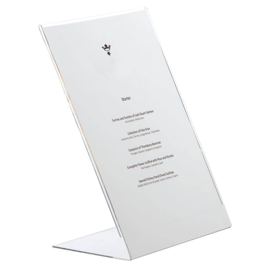 This simple A4 acrylic menu holder from Olympia is ideal for presenting menus, specials and notices on your bars and tabletops. It’s also an ideal way of asking diners to wait to be seated! This slanted A4 plastic menu holder makes it easy to replace sheets quickly and clear displays one A4 sheet. Also available as a double sided, upright design CC447.