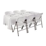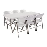 This resilient centre folding table and six chair set is the perfect pop-up furniture for conferences, outdoor catering events, festivals, buffets and wedding banquets. With built-in table carry handles and fold up chairs, transportation between venues is hassle-free and the set is storage friendly. At six foot, this portable and collapsible foldup table is a dream for spacious outdoor dining and decoration. Use either as overflow seating for hotels and restaurants, canteens, or for pub gardens. The set would also be well placed in an event marquee or at any large banquet.What comes in this set?You’ll get one collapsible 6ft table and six foldable chairs. Everything comes fully assembled and ready to use straight from the box.Can I use this set outdoors?Yes, both table and chairs are made from hardwearing HDPE, a tough and weather-resistant plastic, and are fitted with a powder-coated steel frame that’s resistant to both UV and rain damage. This makes the set ideal for any outdoor event. However, to prolong their lifespan, we recommend you store the set indoors when not in use to reduce the likelihood of any undue wear and tear.Is it easy to transport?The table folds down to half size, and is fitted with a carry handle to make it easy to move. The chairs collapse down too and are lightweight enough to transport without much strain. If you’re moving the set regularly, or are shifting multiple sets, we recommend you use a furniture trolley. Shop our collection of furniture trolleys now to find the right one for you.