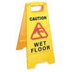 Durable stand-alone wet floor sign makes guests and staff aware of potential hazards