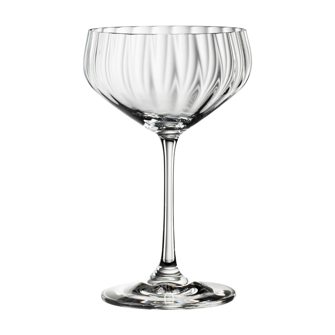 Spiegelau’s Lifestyle coupette glass is at home wherever lifestyle and fashion meet. Their modern diamond shape is emphasized once again by the linear decoration.