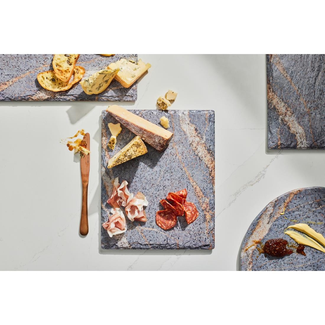 Crafted with the demands of food service in mind, these Quarry round platters are break resistant and can withstand temperatures up to 240°F, ensuring safe use with hot and cold foods. Plus, their BPA-free design is dishwasher safe for easy cleanup.