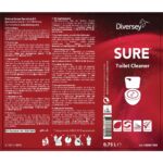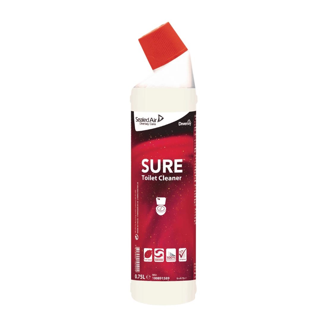 Keep your toilet bowls and urinals hygienic while also improving your green footprint with this pack of 6 x 750ml Diversey SURE toilet cleaner ready-to-use bottles. As this toilet cleaner is made with plant-based ingredients, it contains no hazardous ingredients and is fully biodegradable. This means it will keep staff protected against potentially harmful substances when cleaning and won’t damage the environment when breaking down.Formulated for professional results, this cleaner will quickly tackle limescale, uric scale and other deposits to leave your toilet bowls and urinals dazzlingly clean and fresh.Colour-coded labelling makes this toilet cleaner easy to identify, ensuring your staff always use the correct chemical for the job.