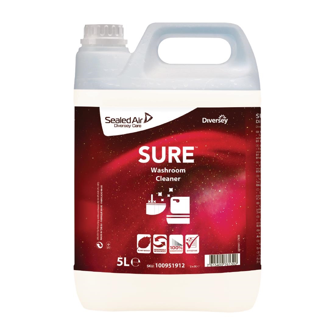 Improve the green footprint of your operation by switching to this pack of 2 x 5Ltr Diversey SURE washroom cleaner concentrate bottles. As this washroom cleaner is made entirely from renewable, plant-based materials, it is completely biodegradable and contains no hazardous ingredients. As such, it will break down without harming the planet and help to keep staff protected against potentially harmful substances when cleaning. Formulated to deliver professional results, this washroom cleaner will effortlessly tackle dirt and grime to ensure your washrooms are always sparklingly clean and hygienic. Colour-coded labelling also makes this chemical incredibly simply to identify. This will prevent any mix-ups when your staff are carrying out their daily cleaning duties. The concentrated solution also allows this washroom cleaner to be used with dosing systems. This will deliver effective and cost-efficient cleaning every time.