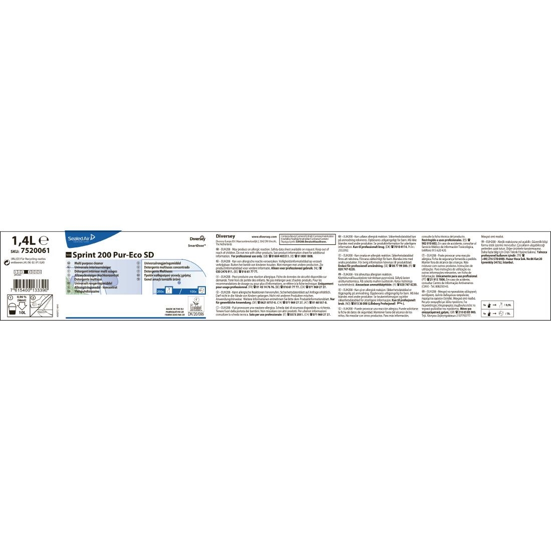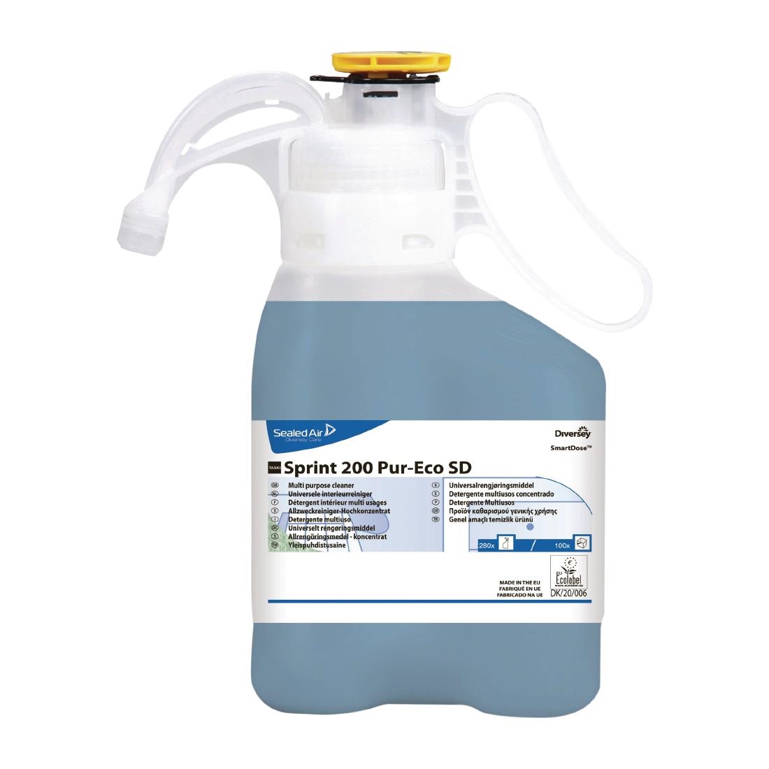 Guarantee effective, efficient and environmentally responsible cleaning with this Diversey TASKI SmartDose Sprint 200 Pur-Eco multi-purpose cleaner. As the solution is formulated for professional use, it will deliver streak-free cleaning of your water-resistant hard surfaces. This will make it extremely easy for you to keep your premises sparklingly clean and in impeccable condition at all times.The state-of-the-art SmartDose packaging ensures a consistent and accurate dosage of chemical every time. This makes it incredibly user-friendly, allowing staff to easily achieve the correct dilution ratios for each cleaning task with minimal wastage. The SmartDose system also requires no water connection or equipment installations, allowing it to be used portably throughout your venue for optimal convenience.As the solution meets the strict environmental and safety criteria of the EU Ecolabel, you can have complete peace of mind that this chemical is kinder to the planet and your employees than traditional cleaners. This will help you to take steps towards a more sustainable and Earth-friendly service.