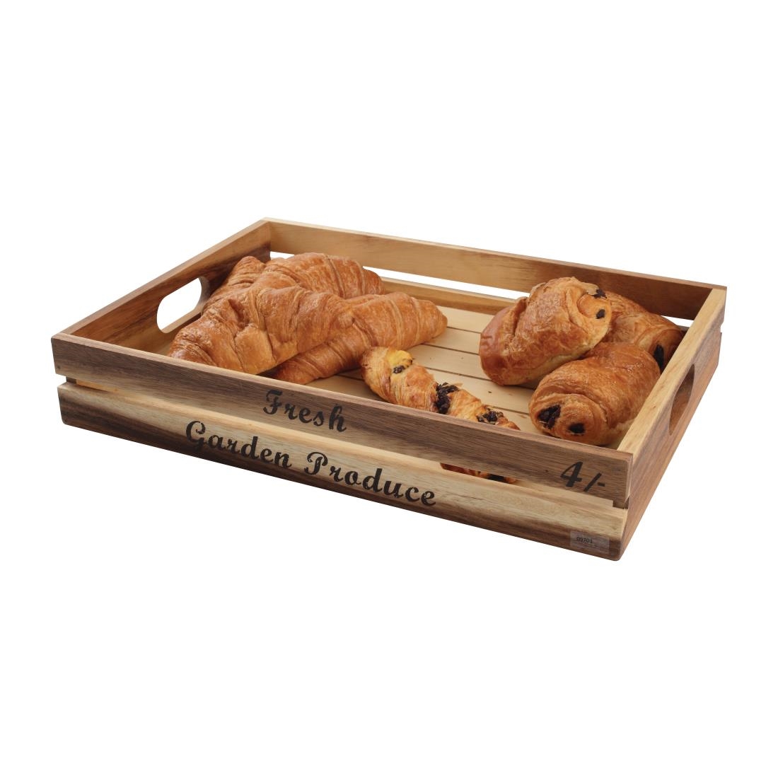 Show off your freshest fruit and vegetables in style by displaying them in this stylish wooden crate from T&G. The natural grain of the acacia wood brings a rustic charm to any food display, and ensures each crate is unique – it’s a backdrop guaranteed to make the bright and vibrant colours of your fresh produce truly stand out.The printed ‘Fresh Garden Produce’ text adds an even greater organic, home-grown charm, but it’s only on one side – if you prefer a blank display, you can just rotate the crate around. To make your display even more visible, consider using it with T&G’s riser (GL068) to create an attractive angled presentation.