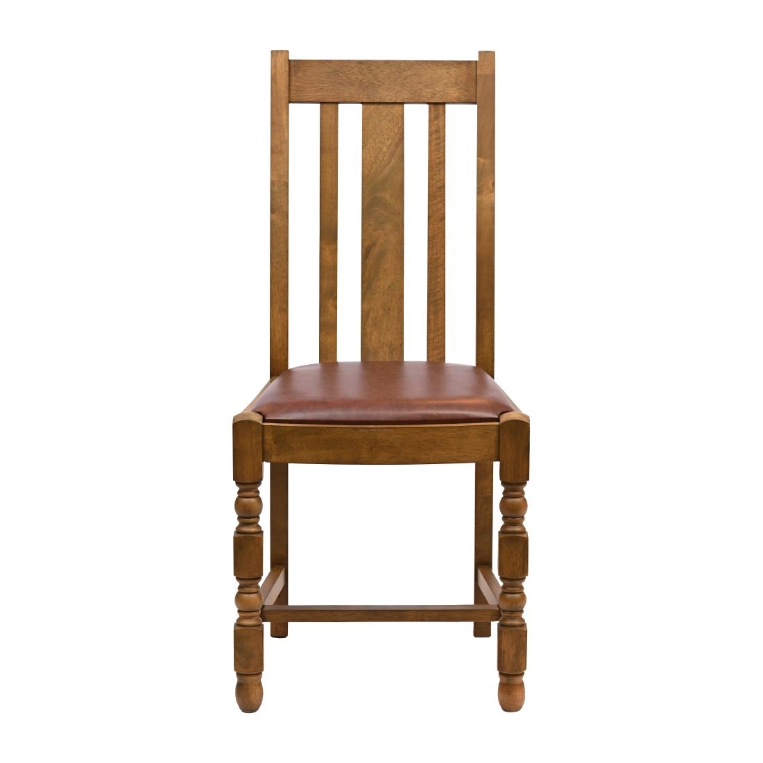 Crafted from rubberwood with a muted weathered oak finish, this set of six Thame dining chairs is upholstered in easy-to-clean Bison Espresso brown vinyl. Each chair conforms to CRIB 5 FR, ensuring it is suitable for hospitality use.