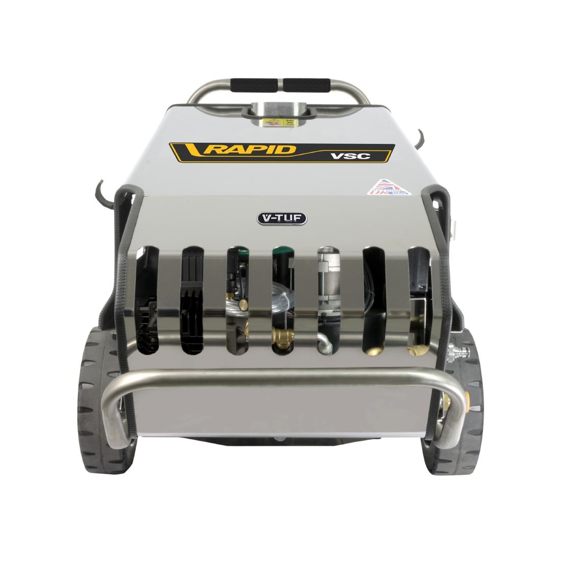 Built with a robust steel chassis and stainless steel cover, the V-TUF Rapid pressure washer features four rugged 10″ wheels for easy transport across uneven terrain. The automatic stop/start motor pump and low water burner cut-out provide reliable operation, whilst the 24 litre removable fuel tank supports extended cleaning sessions up to 6 hours per day. The two-piece lance assembly includes five quick-release jets for versatile cleaning applications.