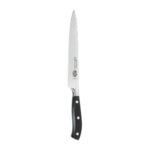 The fully forged Victorinox slicing knife is a tool best known for its ability to perform the smooth cutting action required for preparing sushi, sashimi, and breaking down large fish as well as slicing cook meats. The 20cm knife has a pointed black tip, tapering evenly towards the cutting edge to help retain its shape for longer, meaning it will need sharpening less often than other knives. Within a set of chef’s knives, this slicing knife will save you the most time when it comes to preparing large cuts of meat and fish, thanks to its long, slender shape and premium riveted bolster.