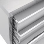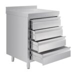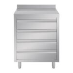 The Vogue workstation has all your storage needs covered, with four drawers and 60mm high upstand to prevent items falling down at the back. Thanks to adjustable feet, the unit can also be balanced to suit uneven flooring or any knocks and bumps within the environment. For any paperwork including temperature log books, HACCP recorders and stationary, this robust stainless steel storage unit is the sensible choice for a busy working environment.Four-drawer stainless steel unit with 60mm upstand. 900 mm high (not including upstand), 700mm wide and 600mm deep.