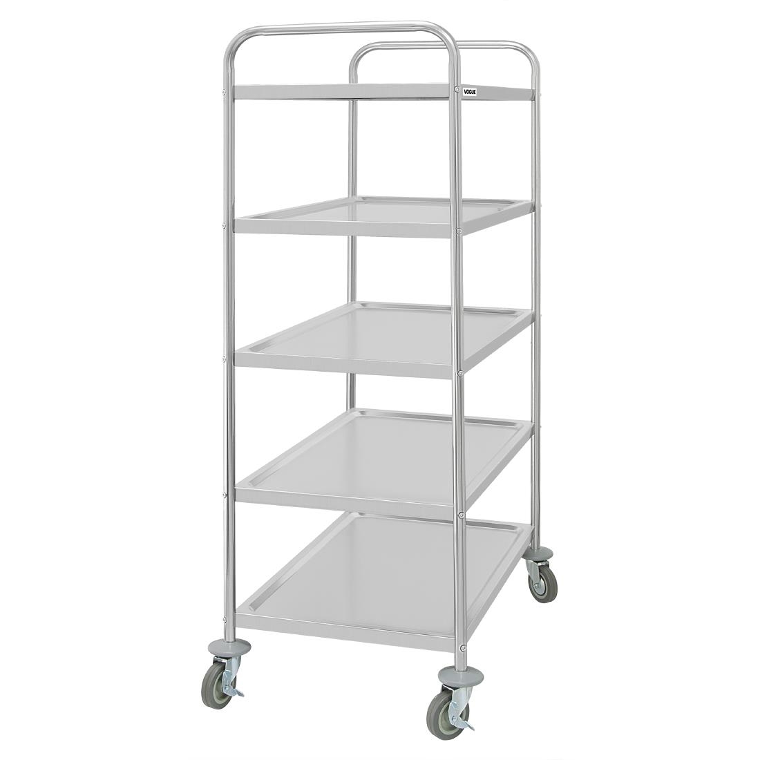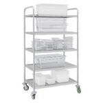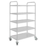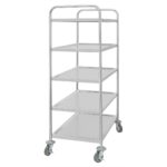Strong and durable, the large size five tier Vogue trolley is a great solution for transporting items between areas. Constructed from stainless steel throughout, the trolley is both easy to clean and maintain and provides a hygienic base to transport items, whether that’s utensils, plated meals, drinks dispensers, linen or cleaning materials. The trolley is incredibly easy to assemble and includes four heavy duty castors, two of which include strong brakes to prevent the trolley from moving – perfect if you need to position the trolley in a sloped area. And thanks to the indentation on each tier, items are prevented from falling off during transportation. The indentation also ensures any spilt liquids are kept on the trolley, rather than leaking onto the floor – a time-saving addition to your site safety.