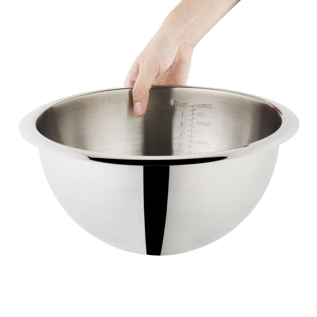 Make mixing and baking easy with the Vogue 4 litre heavy duty graduated mixing bowl. Designed with intermittent measuring marks on the inside of the bowl, this kitchen essential allows you to beat and measure your mixtures simultaneously, drastically reducing your preparation times while ensuring accurate food preparation. Made from robust stainless steel, the bowl is exceptionally durable and hardwearing, allowing it to withstand constant use in any busy catering environment. The stainless steel material also makes this bowl incredibly easy-to-clean, ensuring you always prepare food hygienically.