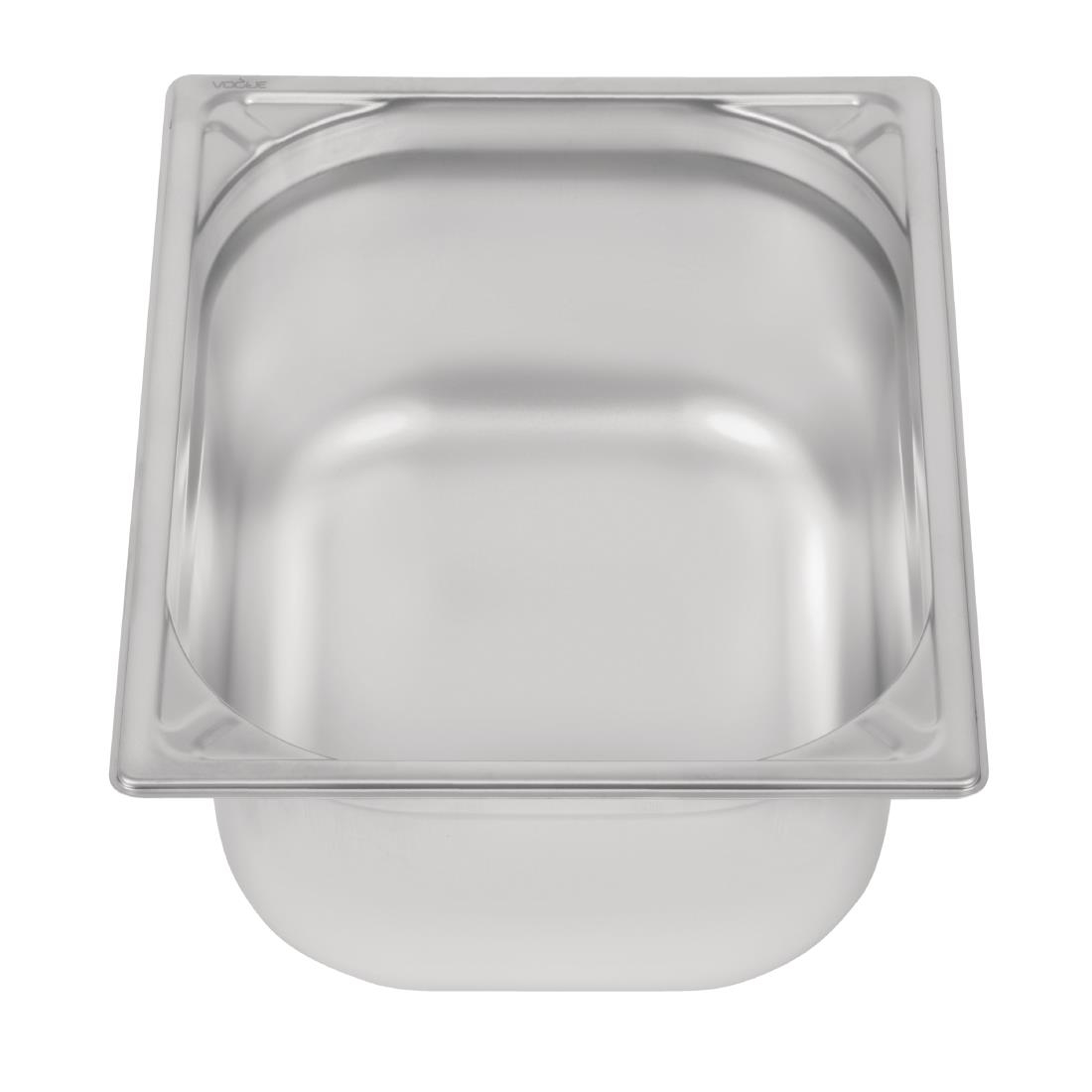 Prepare, serve and store your food easily and conveniently with this Vogue stainless steel 1/2 GN pan (150mm/9Ltr).How big is a 1/2 gastronorm container?Size 1/2 gastronorm pans are amongst the largest varieties of gastronorm pans, made to store large amounts of food. A 1/2 gastronorm container has a length of 325mm and a width of 354mm, with this variety having a depth of 150mm, giving it a large capacity for storing food.Is this gastronorm container vulnerable to breakage?The Vogue stainless steel 1/2 gastronorm pan is built with a strong stainless steel construction, withstanding the daily stresses of life in a professional catering environment. In addition, this gastronorm pan boasts reinforced corners, making it resistant to warping and shattering.Is this pan stylish?The stainless steel of this pan gives it a sleek and aesthetically-pleasing finish, which is perfect for including in front of house buffet stations. To maintain this stylish look, the stainless steel should be maintained through regular cleaning and polishing.