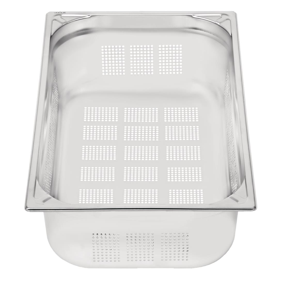 Save yourself the cost and hassle of replacement with this 150mm deep heavy duty 1/1 size gastronorm pan, offering a robust 304 stainless steel construction with reinforced corners. This makes the pan extremely tough and able to stand up to the rigours of very day life in a busy service environment, even if dropped on a concrete floor. The pan is also designed with an overhanging rim which secures it when placed in a prep, buffet station or GN pan rack. Prepare, cook, store and serve food with this GN pan from trusted brand Vogue, which offers a long, reliable service life. The perforations ensure that food can be steam cooked evenly, and allows moisture to escape in order to prevent sogginess.