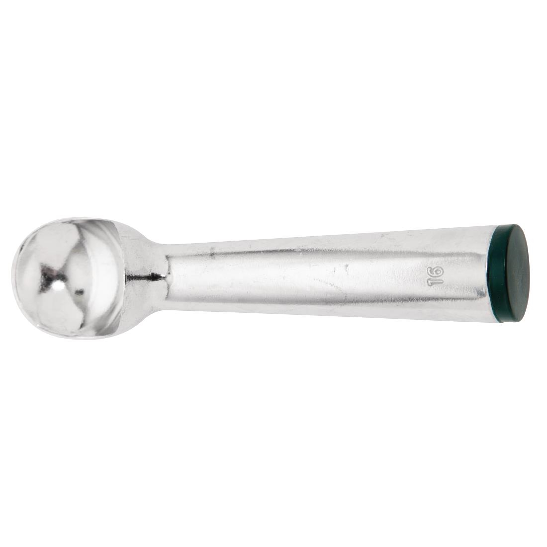 Serve ice cream with speed and accuracy, thanks to the Vogue green ice cream scoop. Made with a conductive liquid in the handle, the scoop warms in your hand to effortlessly carve into ice cream and other frozen desserts, drastically reducing your service times. Serving 16 scoops per litre, the utensil allows you to control portion sizes with expert precision, reducing wastage to save you money. Featuring a green cap and numbered handle, the scoop can also be easily identified to help you use the correct tool for each order. Constructed from incredibly strong aluminium, this utensil is very robust and reliable, giving you excellent results for longer.