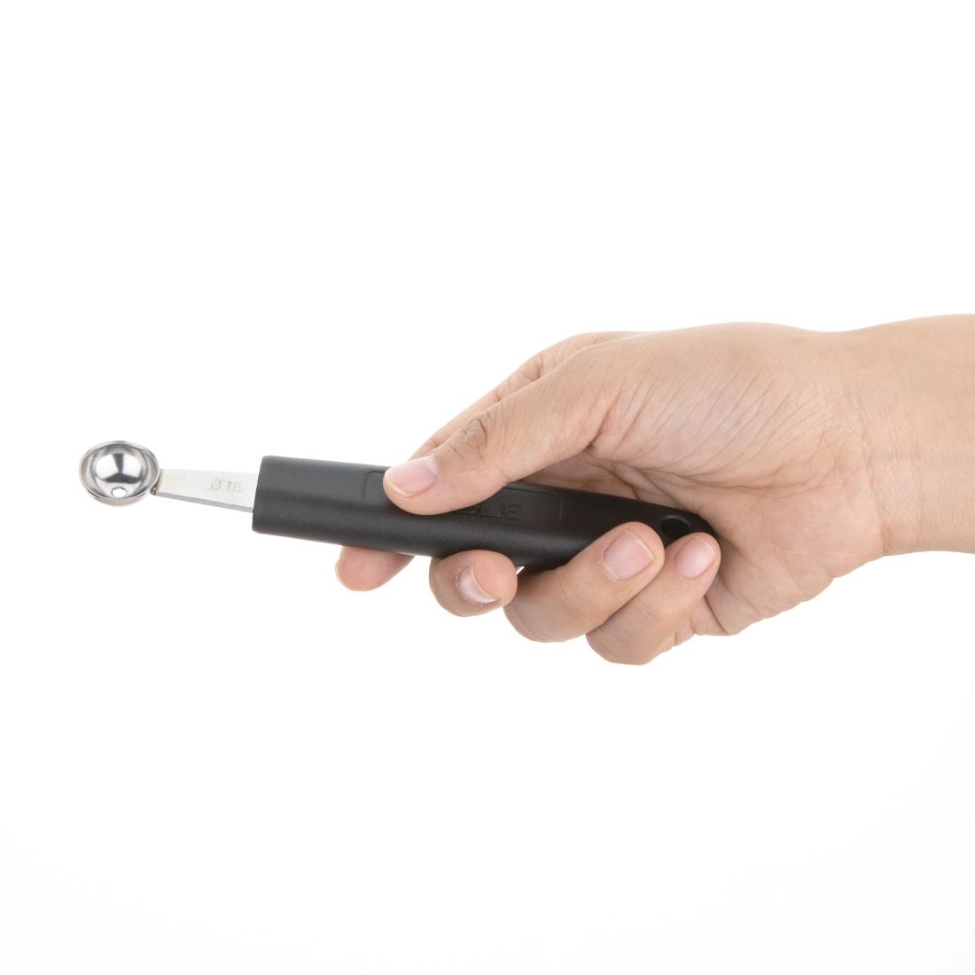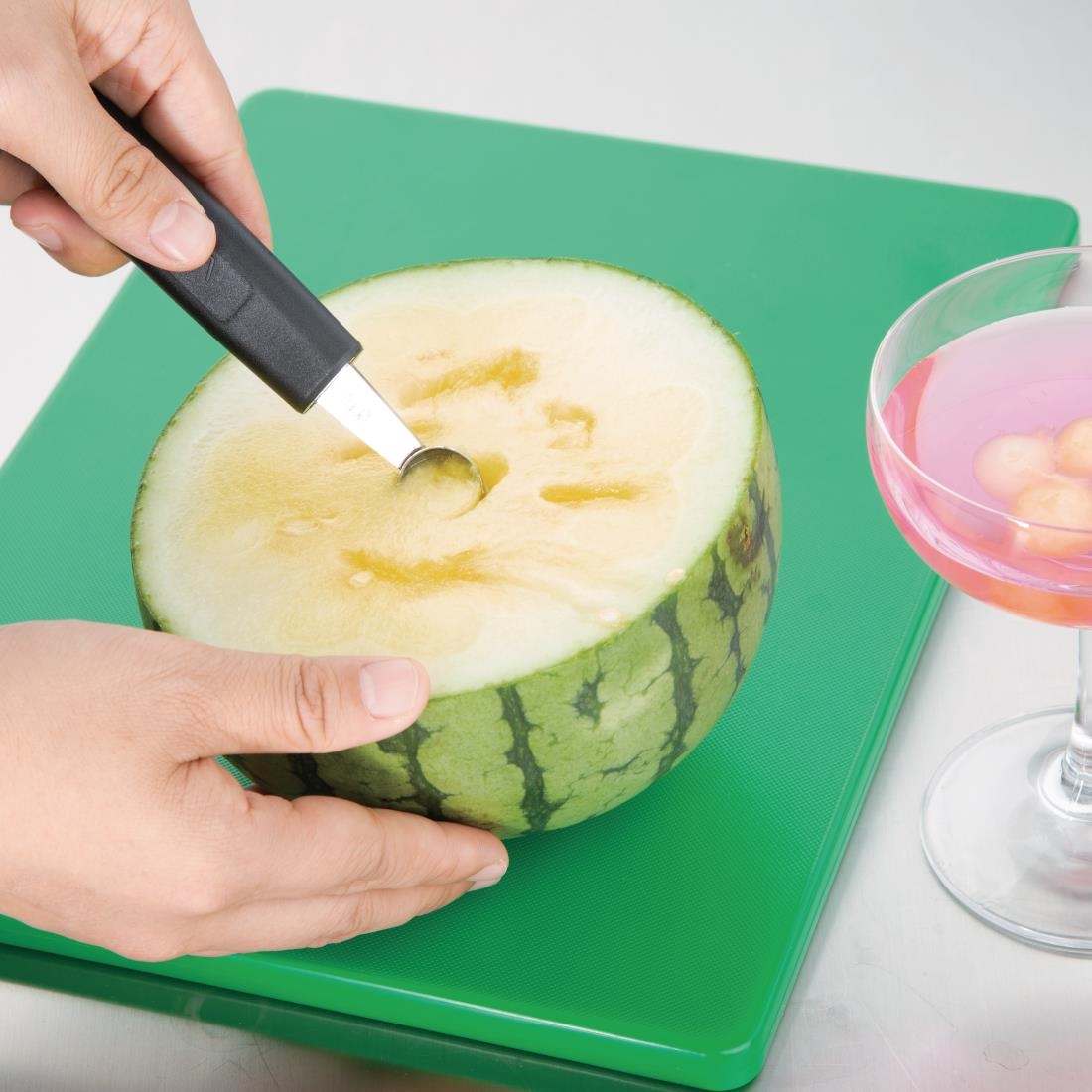 Create perfectly shaped melon balls with the Vogue 18mm melon baller. Constructed from stainless steel, the baller head quickly carves into all manner of ingredients, allowing you to obtain consistent spheres to improve your presentation and control portion sizes. Made with an ergonomically designed polypropylene handle, the utensil is also incredibly comfortable in the hand, helping you cope with lengthy tasks. Ideal for salads and garnishing dishes and cocktails, the professional utensil will help you add a touch of class to your service.