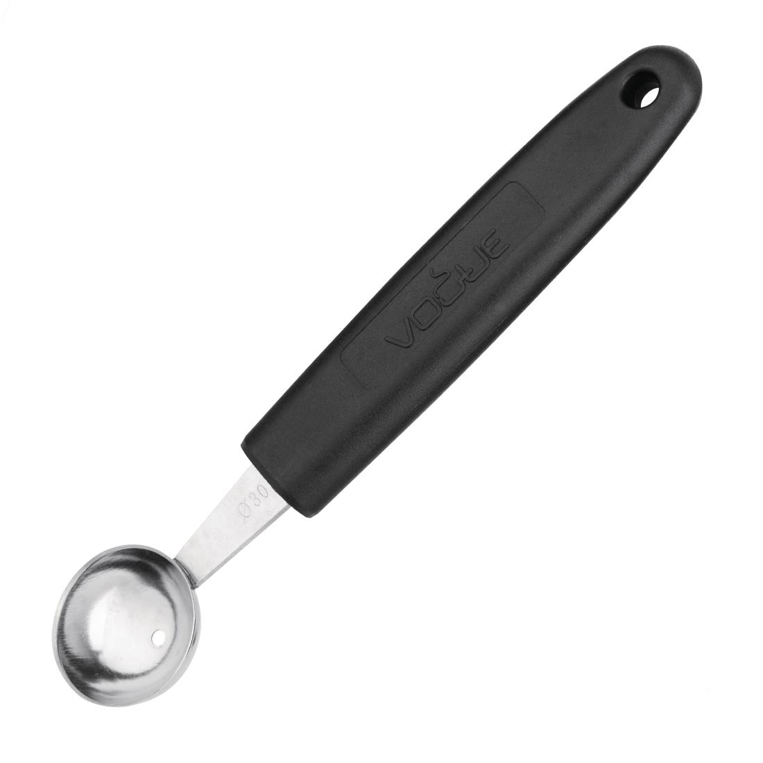 Create perfectly shaped melon balls with the Vogue 30mm melon baller. Constructed from stainless steel, the baller head quickly carves into all manner of ingredients, allowing you to obtain consistent spheres to improve your presentation and control portion sizes. Made with an ergonomically designed polypropylene handle, the utensil is also incredibly comfortable in the hand, helping you cope with lengthy tasks. Ideal for salads and garnishing dishes and cocktails, the professional utensil will help you add a touch of class to your service.