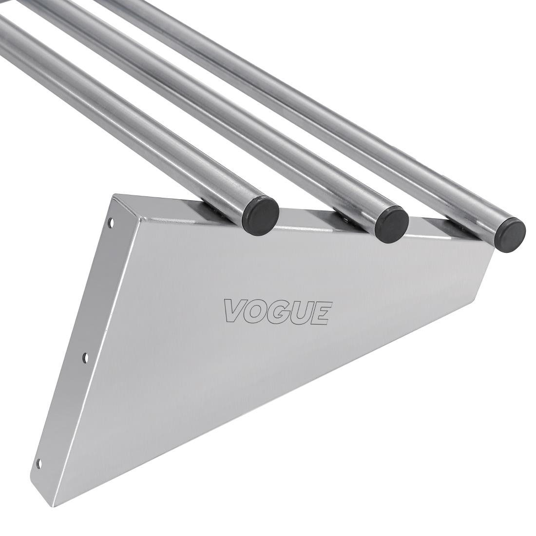 Strong stainless steel shelves for hanging and storing cookware and kitchen equipment.