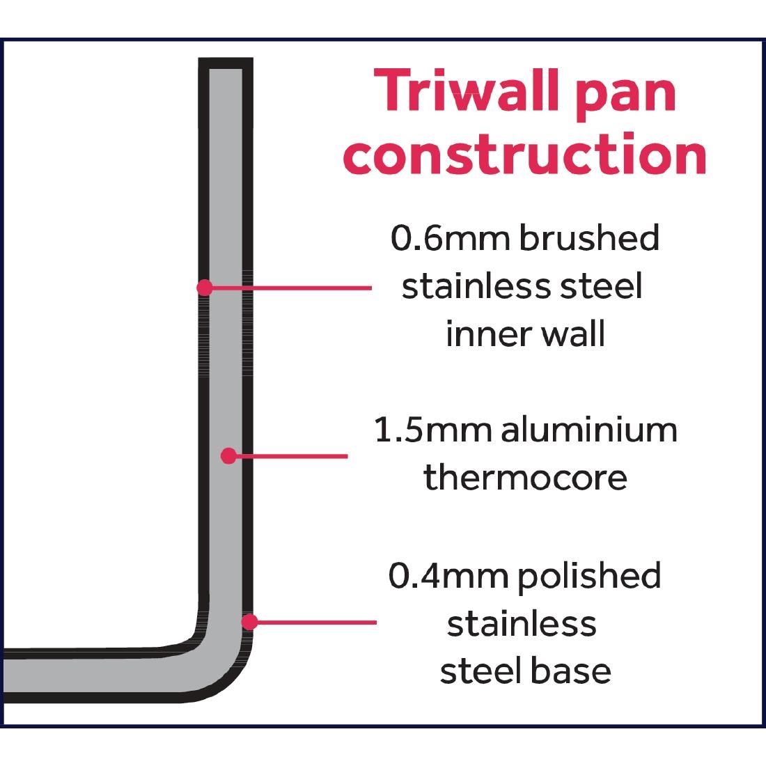 Part of the premium pan range from Vogue, this Tri-Wall heavy duty saucepan features a specially designed layered construction. It has an aluminium thermocore that is sandwiched between stainless steel walls providing even heat distribution without hot-spots and making it ideal for all manner of cooking tasks. Lid sold separately.