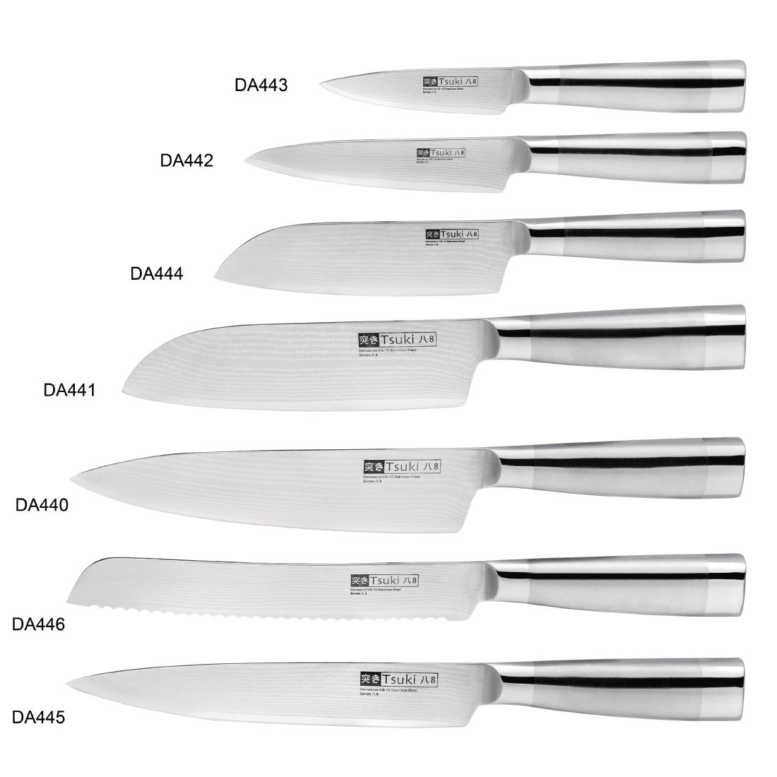 This high quality and attractive Santoku knife from Vogue Tsuki is designed to make food prep quick and easy, whilst enduring constant use in busy kitchens. The core of the blade is made from Japanese VG-10 stainless steel and covered with 2 layers of Damascus steel. This makes it razor sharp, easy to hone and durable, perfect for any chef in any kitchen, from restaurants to homes. The handle balances the knife, making it comfortable and precise.